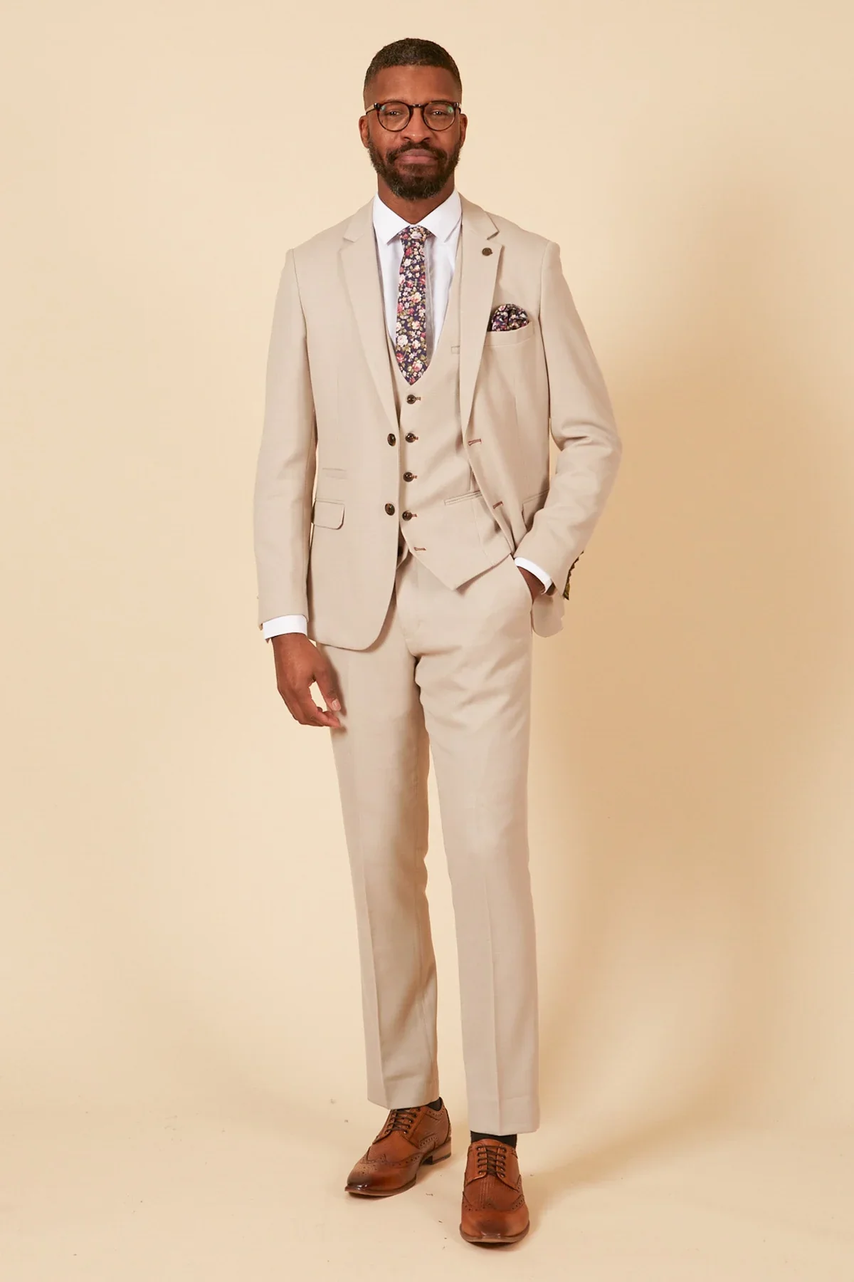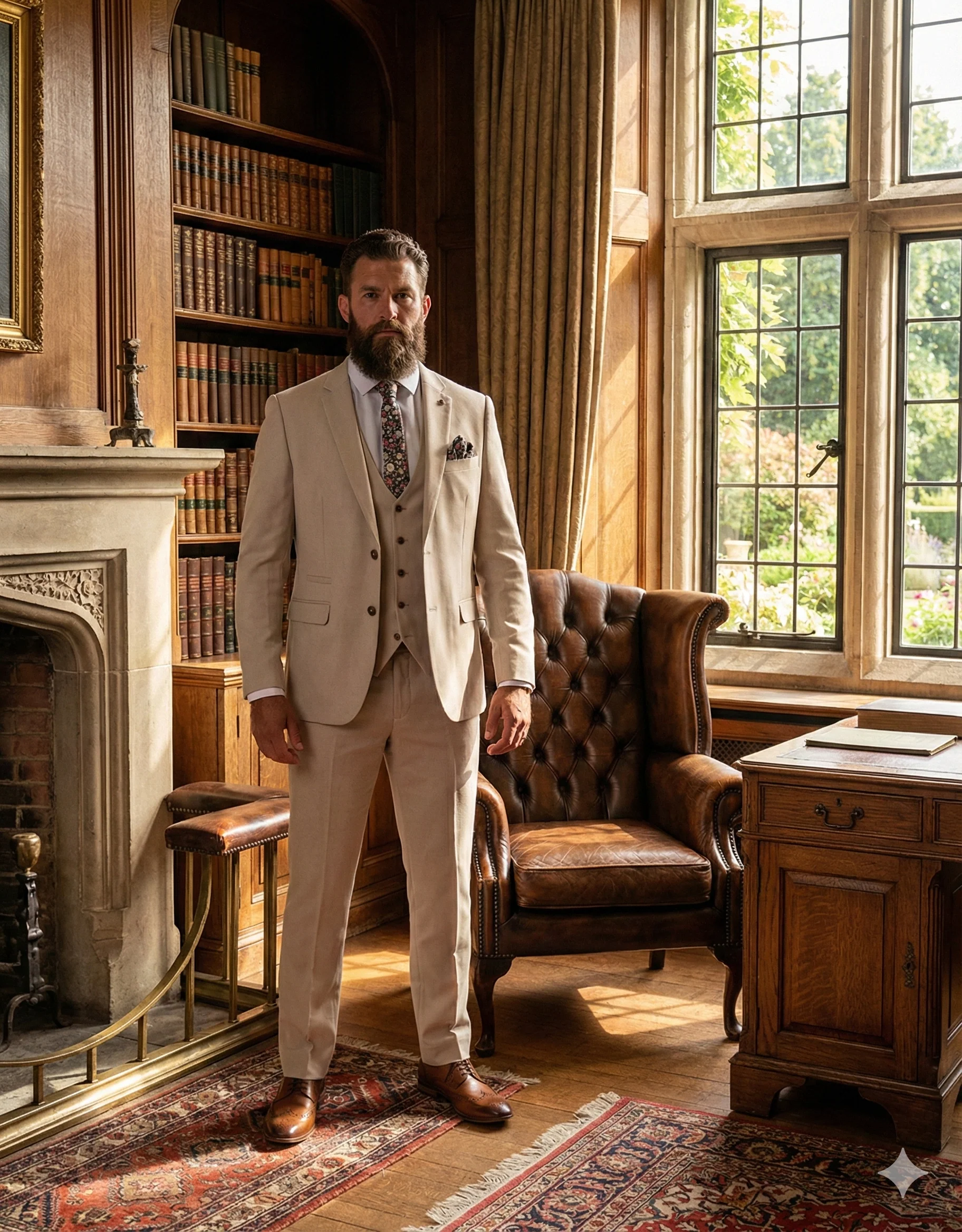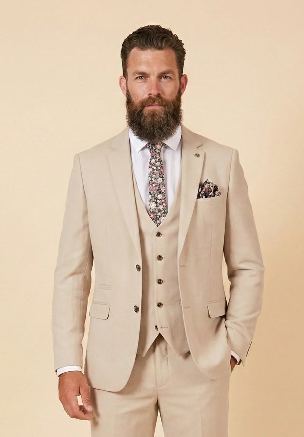 Het begint bij het gevoel. Het HM5 Stone pak is niet zomaar licht; het vangt zomerlicht en geeft het terug als zelfvertrouwen. Je stapt het terras op, of wandelt een eeuwenoude kerk binnen waar de lucht ruikt naar rozen en champagne. De stone-kleurige stof – helder, zacht, een statement zonder schreeuw. Je colbert valt soepel over je schouders, het gilet accentueert je silhouet, en de pantalon loopt als vanzelf met je mee.