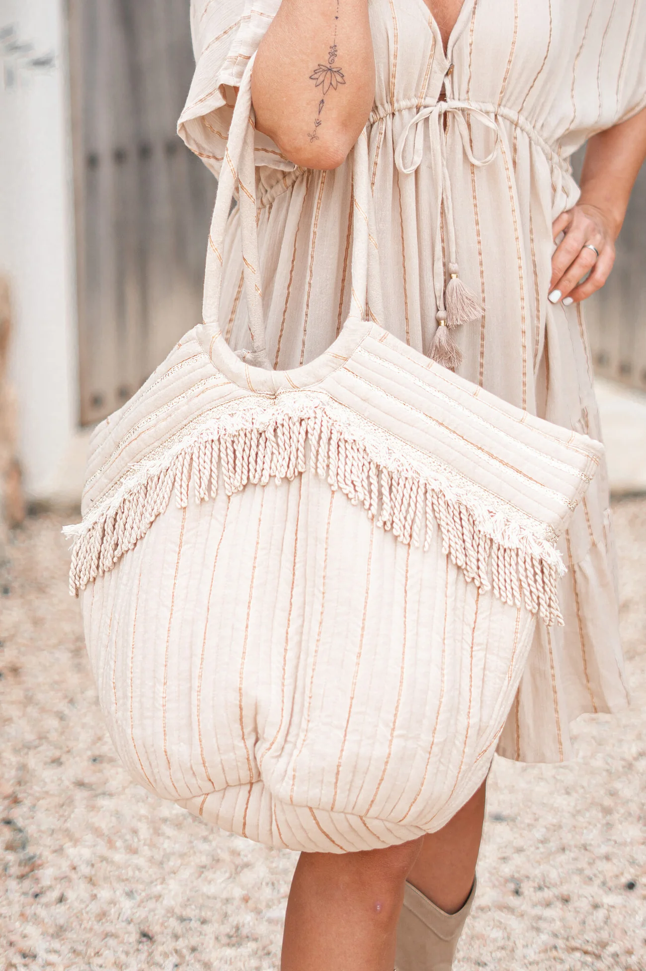 Op zoek naar een item met bohemian flair? Dan is de Bag Elvio Stripe Sand van ibzmode jouw match. Rijkelijk bewerkt met lurex garen en franjes, heeft hengsels voor op de schouders, kunnen niet verst Bestel snel en geniet van de bohemian lifestyle, elke dag opnieuw.