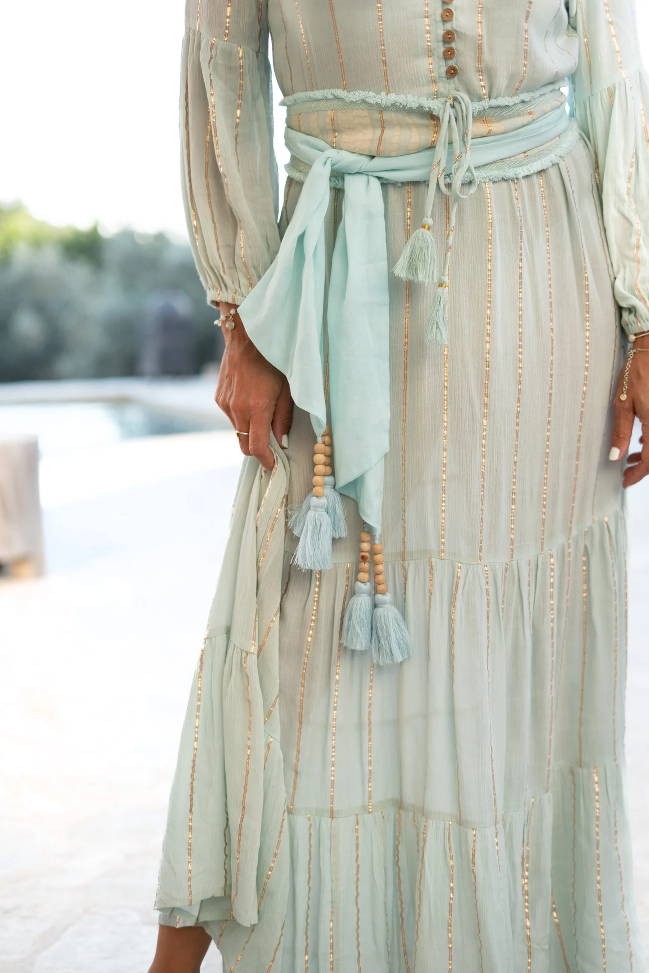 Creëer jouw ultieme zomerse look met de Belt Ese Baroque Mint in de kleur mint. Makkelijk in de taille te knopen, versierd met franjes en houten kralen De luchtige stof voelt zacht aan op je huid. Voeg deze must-have toe aan je zomergarderobe.