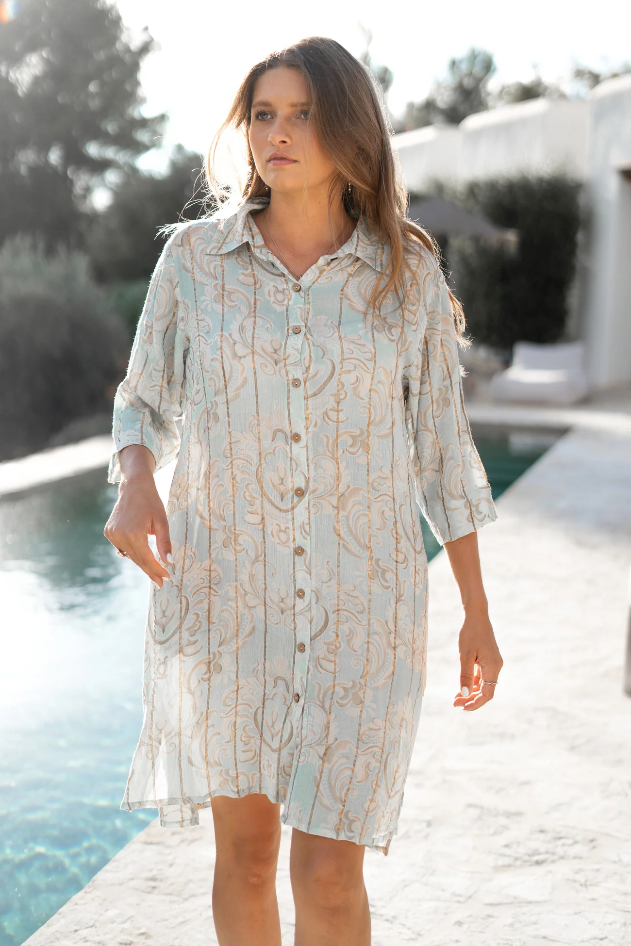 Deze Blouse Aletta Baroque Mint Print van ibzmode in het pale blue ademt Ibiza vibes. Heeft een kraagje, knoopjes, lurex garen door de stof, draagt luchtig De luchtige stof voelt zacht aan op je huid. Shop nu bij ibizamode en straal deze zomer in stijl.