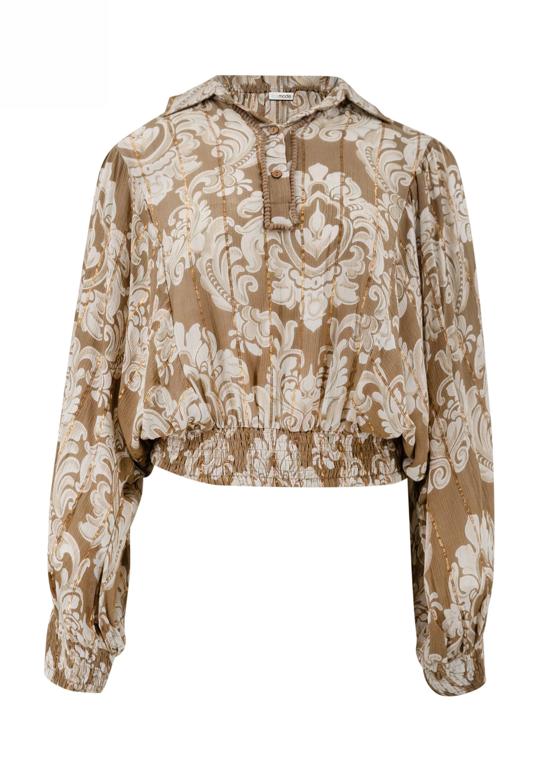 Op zoek naar een item met bohemian flair? Dan is de Blouse Briso Baroque Taupe print van ibzmode jouw match. Heeft een opstaand kraagje, heeft knoopjes om de blouse te sluiten, is bewerkt met gouden lurex gare Het natuurlijke materiaal zorgt voor een luchtige feel. Laat de zomer maar komen – jij bent er klaar voor.