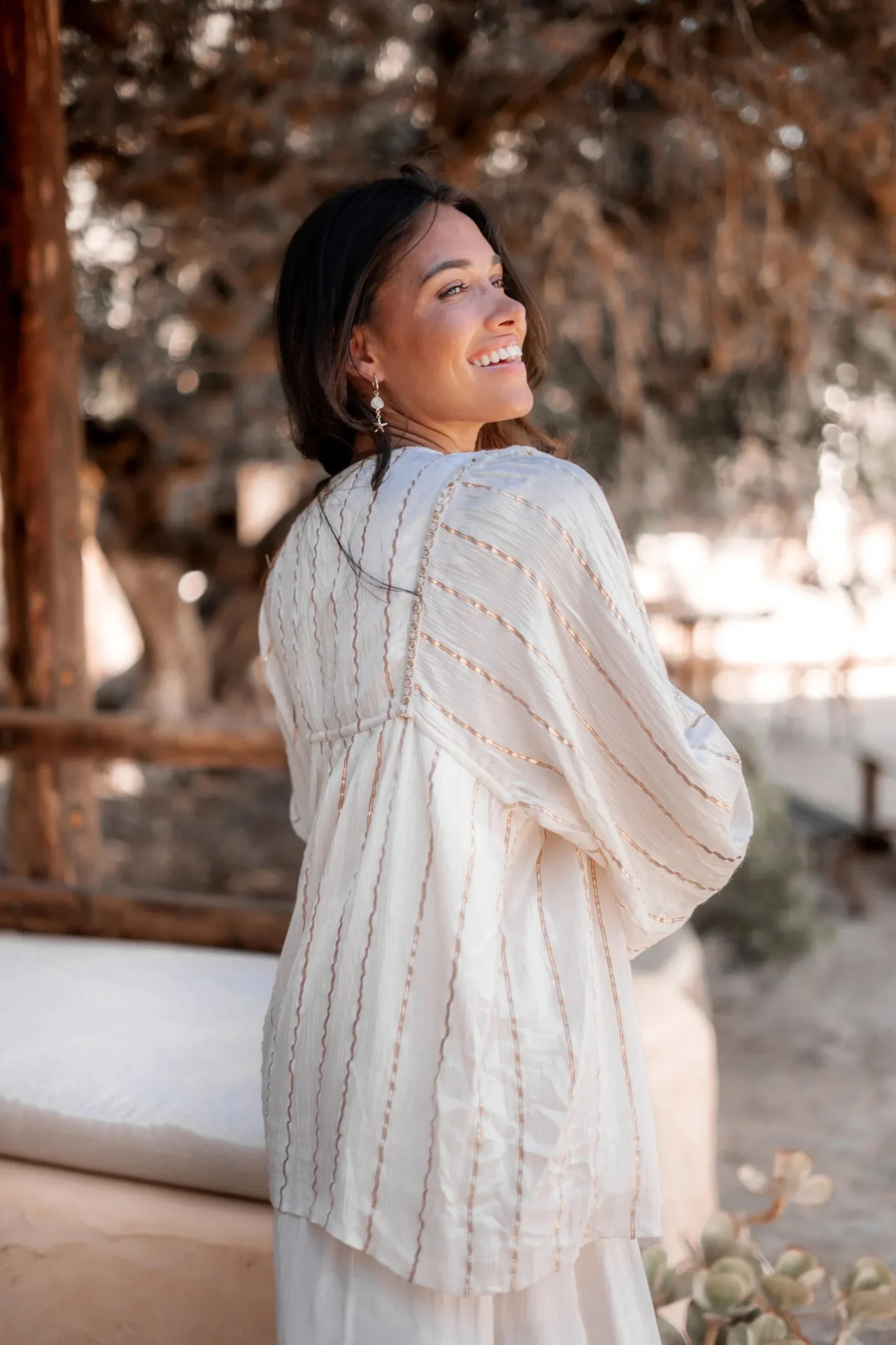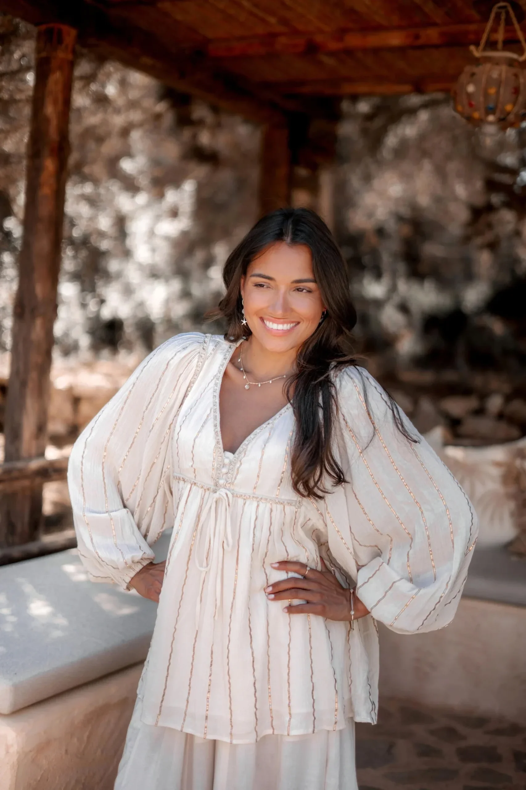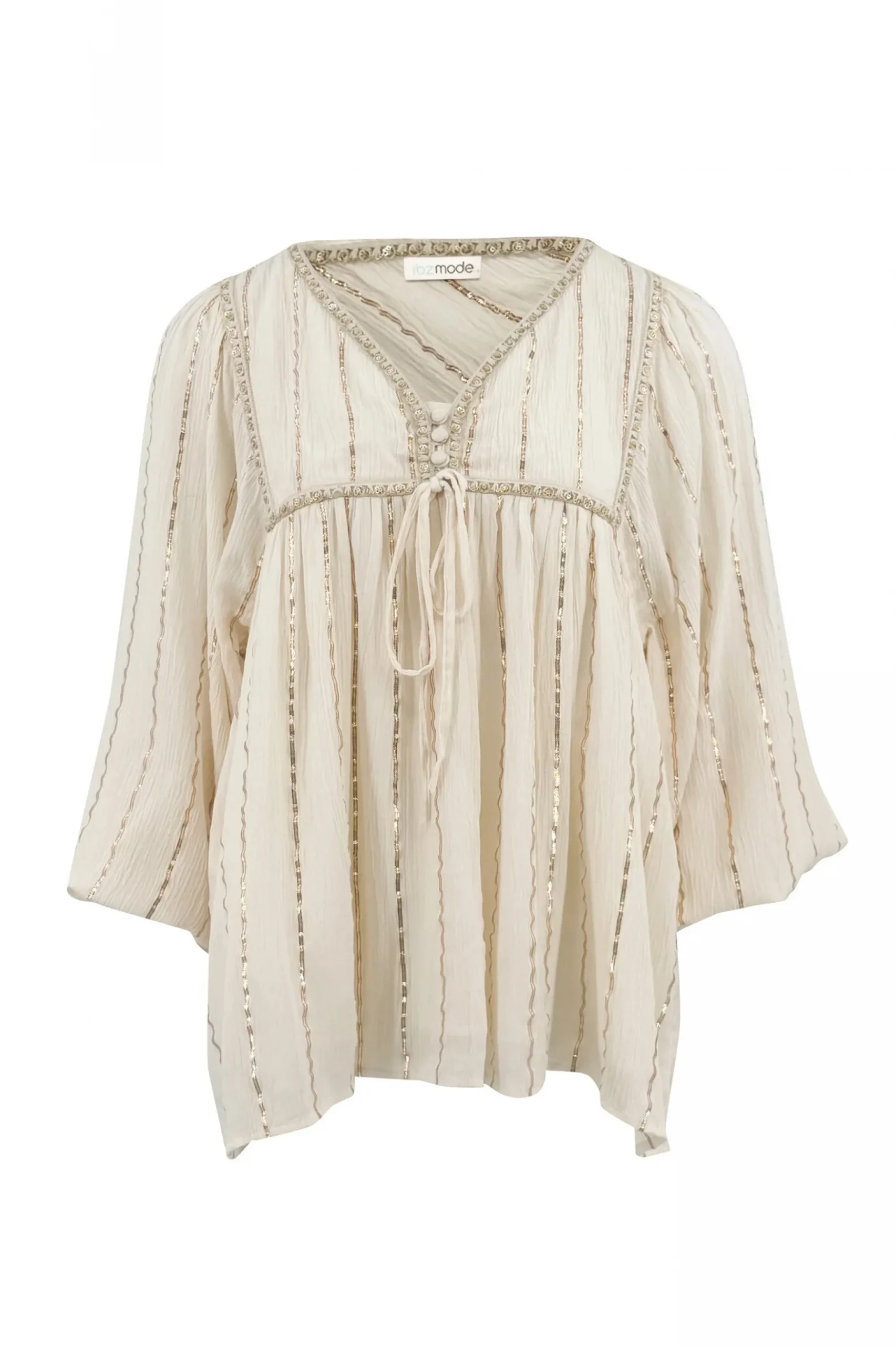 Creëer jouw ultieme zomerse look met de Blouse Gigi Stripe Ecru in de kleur ecru. Heeft een V-hals met knoopjes, pofmouwen met een elastische band bij de polsen, bewerkt met lurex Perfect te combineren met slippers, een basic top of een lichte blouse. Voeg deze must-have toe aan je zomergarderobe.