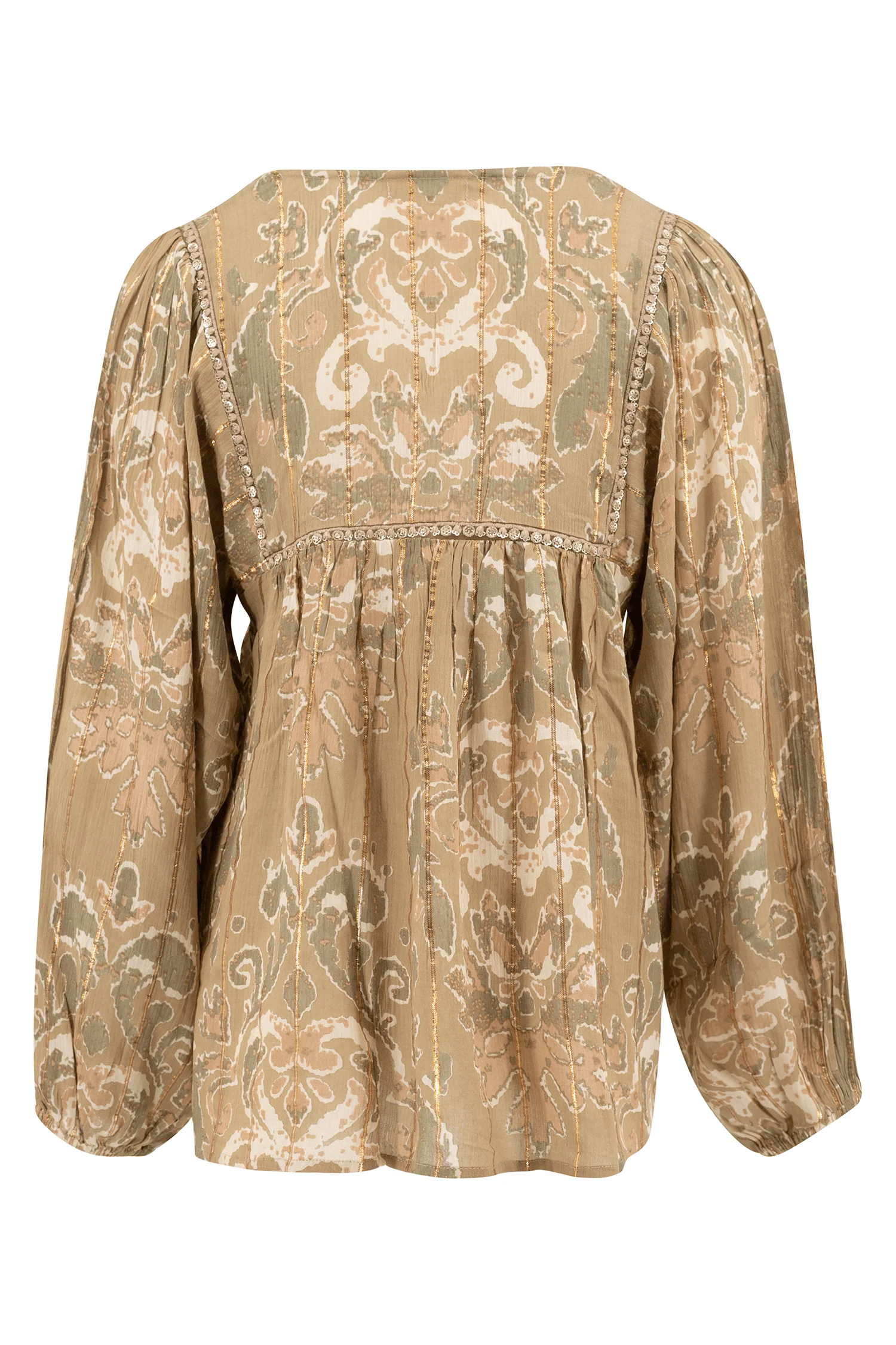 Geef jouw garderobe een update met de Blouse Kiki Barok Khaki, ontworpen voor zonnige dagen. Heeft een V-hals, heeft een barok print, bewerkt met gouden lurex garen en lovertjes, knoopjes bij d Gemaakt van 100% rayon, licht en comfortabel voor warme dagen. Nu verkrijgbaar bij ibizamode – ontdek meer op Brands of Ibiza.