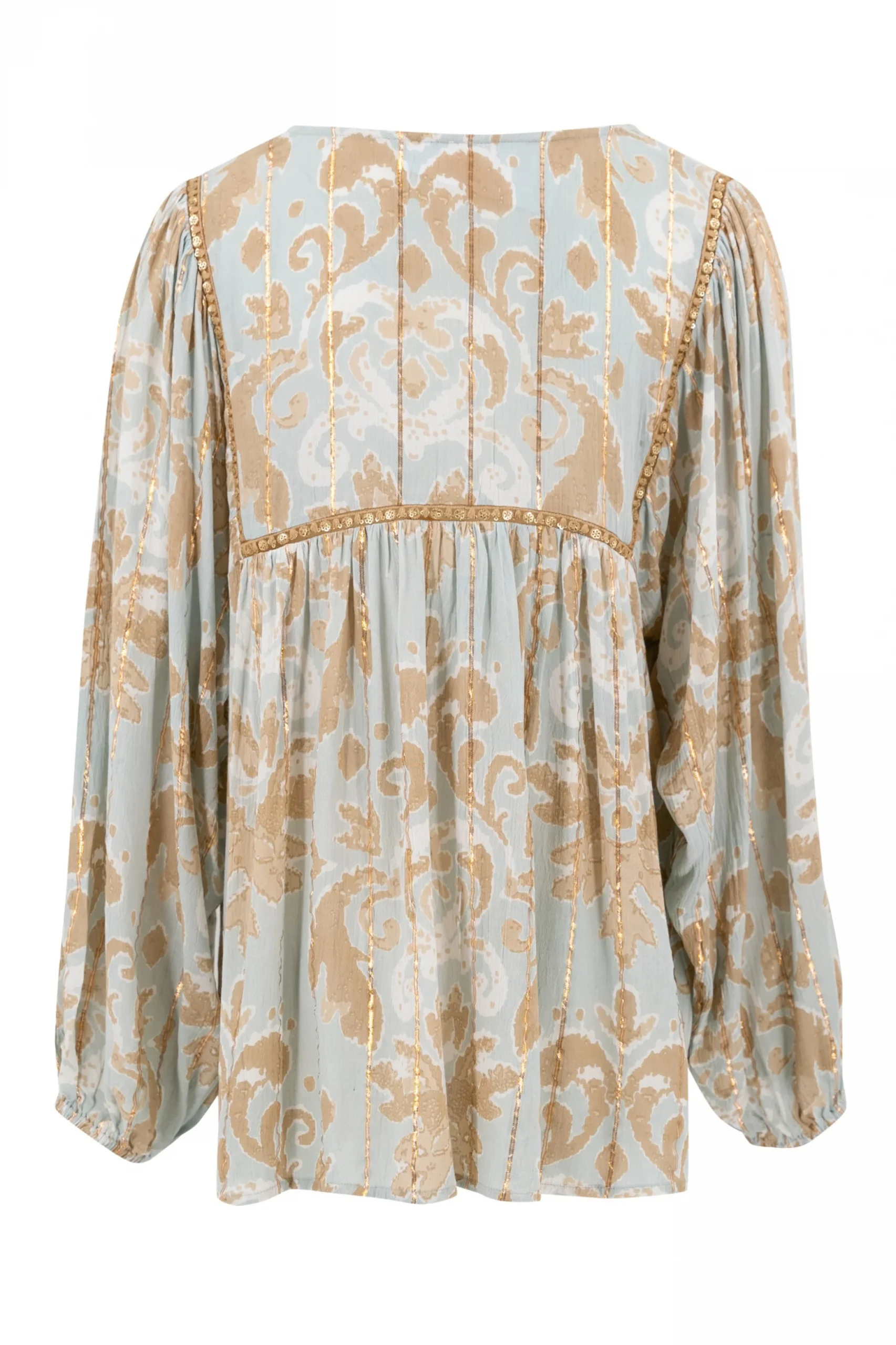 Met de Blouse Kiki Barok Mint van ibzmode ben je klaar voor elke summer getaway. Heeft een V-hals, heeft een barok print, bewerkt met gouden lurex garen en lovertjes, knoopjes bij d Het natuurlijke materiaal zorgt voor een luchtige feel. Nu verkrijgbaar bij ibizamode – ontdek meer op Brands of Ibiza.