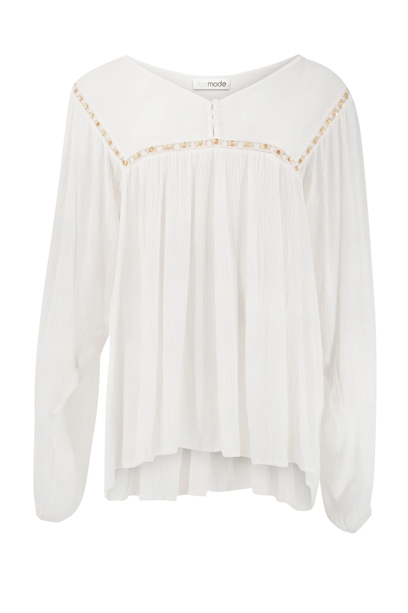 Geef jouw garderobe een update met de Blouse Kiki Paisley Ivory, ontworpen voor zonnige dagen. Heeft een V-hals, bewerkt met gouden lurex garen en lovertjes, knoopjes bij de buste, ballon mouwen Het natuurlijke materiaal zorgt voor een luchtige feel. Shop nu bij ibizamode en straal deze zomer in stijl.
