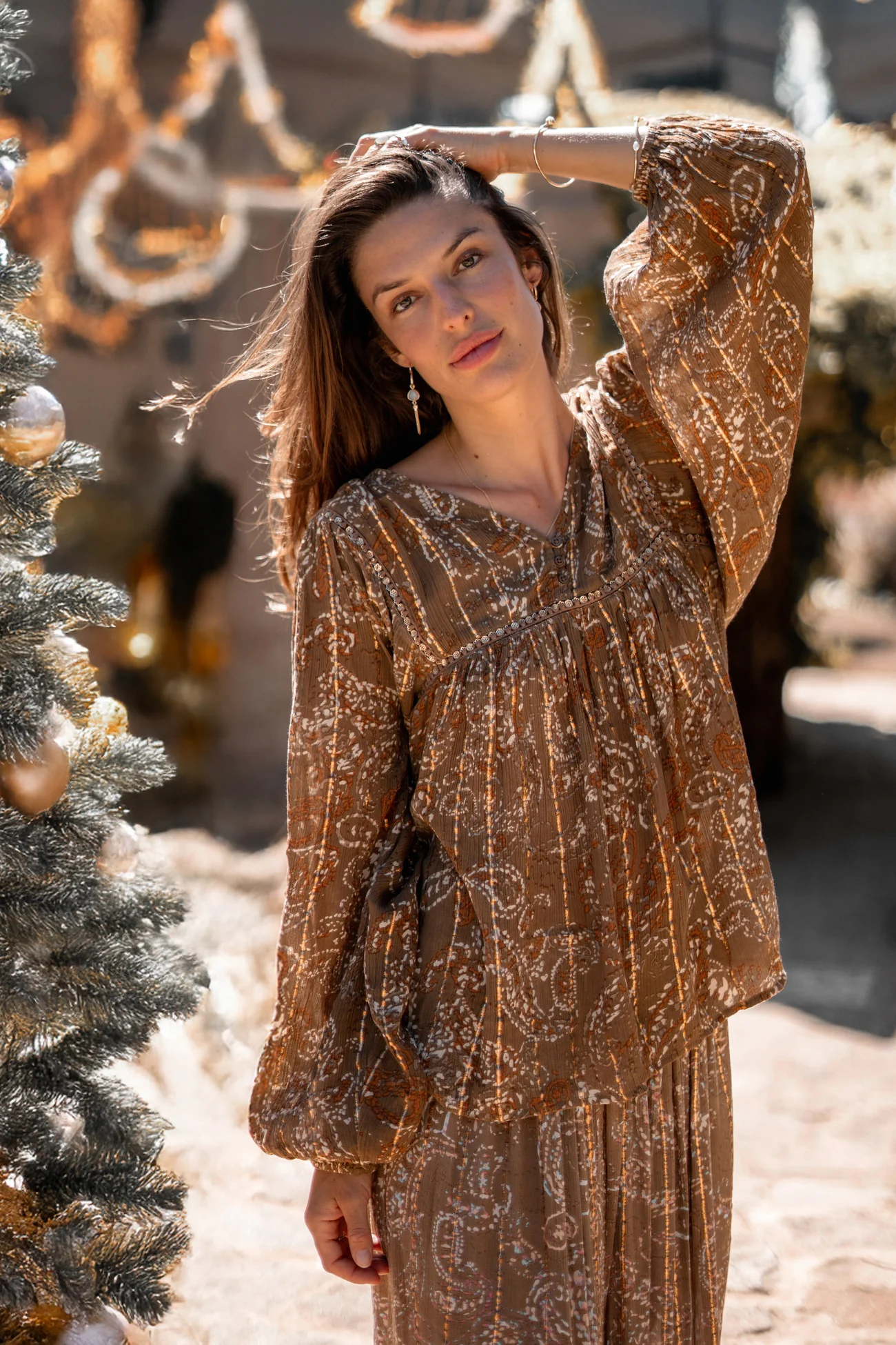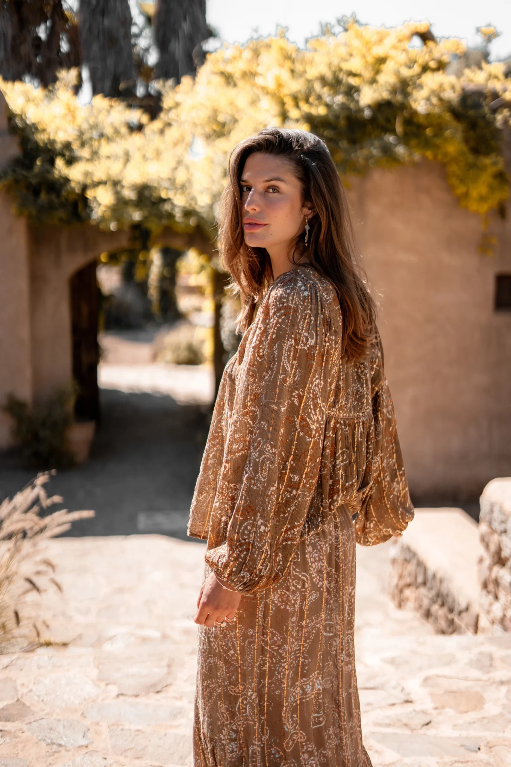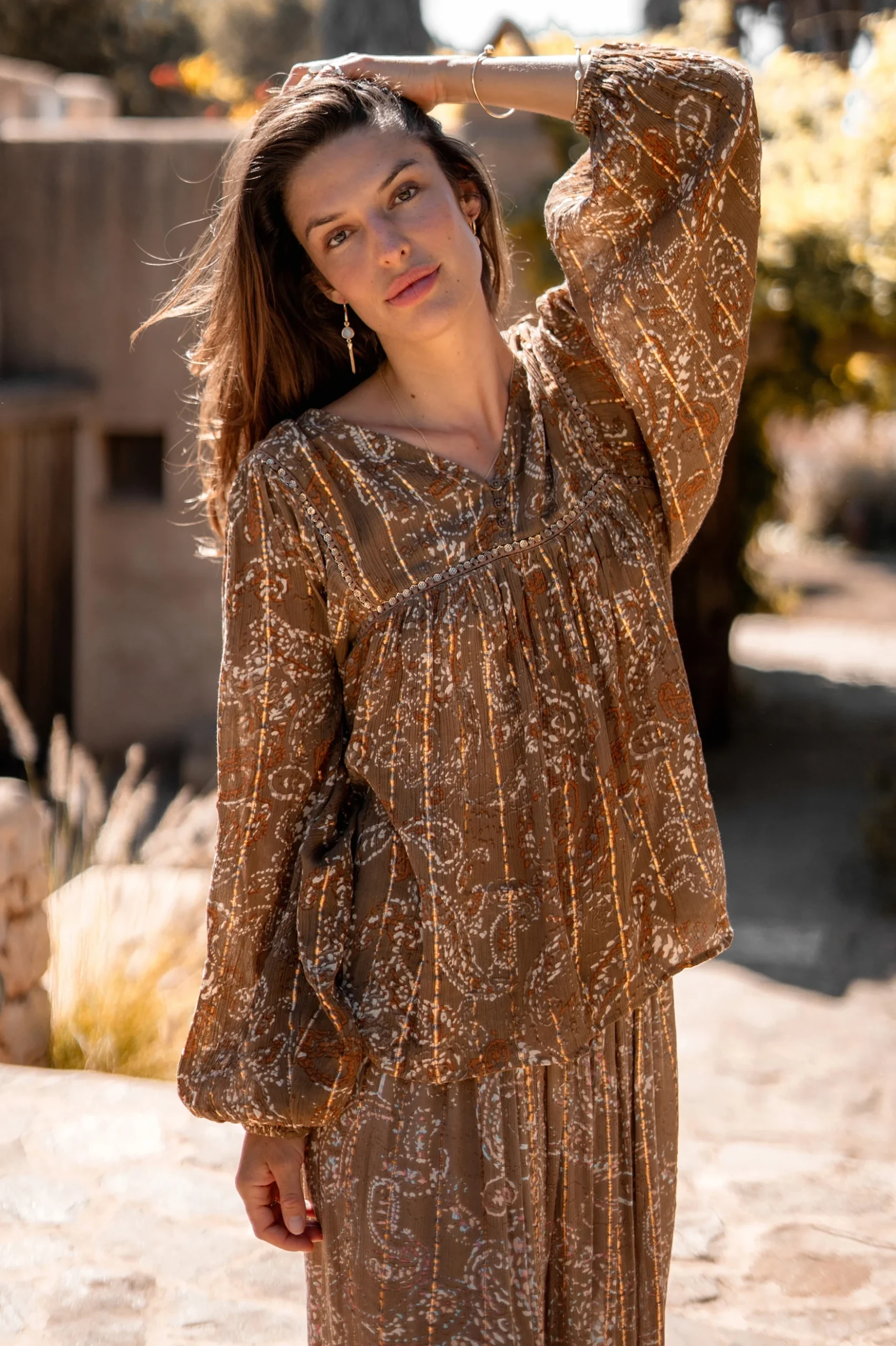 Met de Blouse Kiki Paisley Taupe van ibzmode ben je klaar voor elke summer getaway. Heeft een V-hals, heeft een print, bewerkt met gouden lurex garen en lovertjes, knoopjes bij de bust Het natuurlijke materiaal zorgt voor een luchtige feel. Laat de zomer maar komen – jij bent er klaar voor.