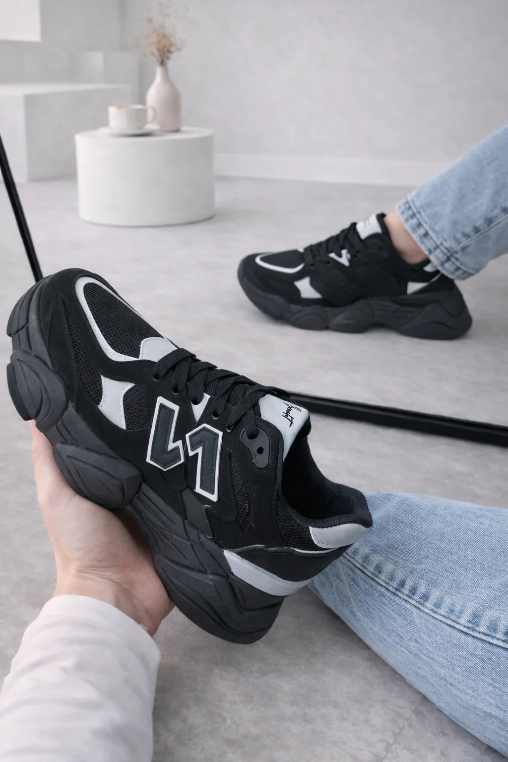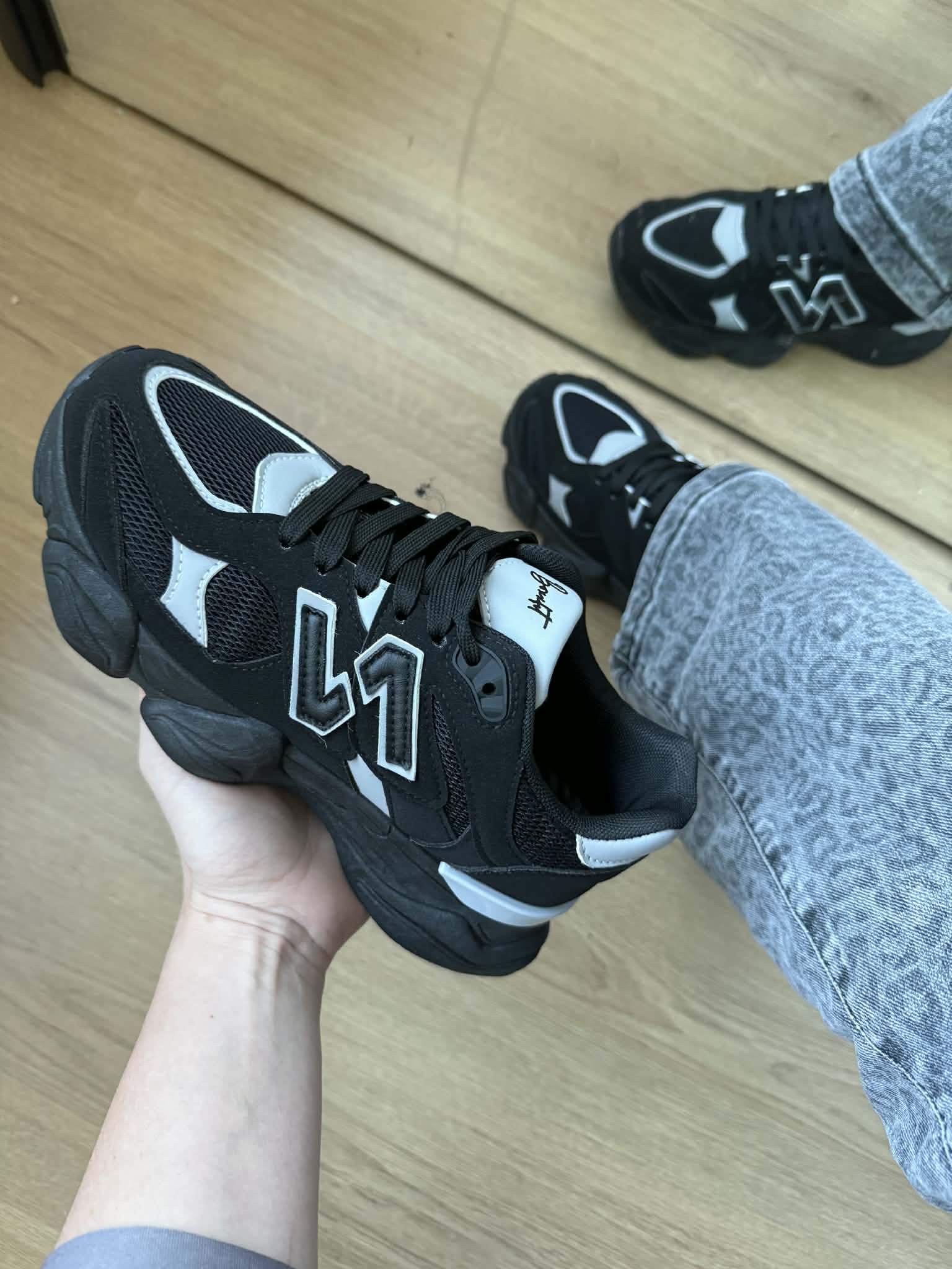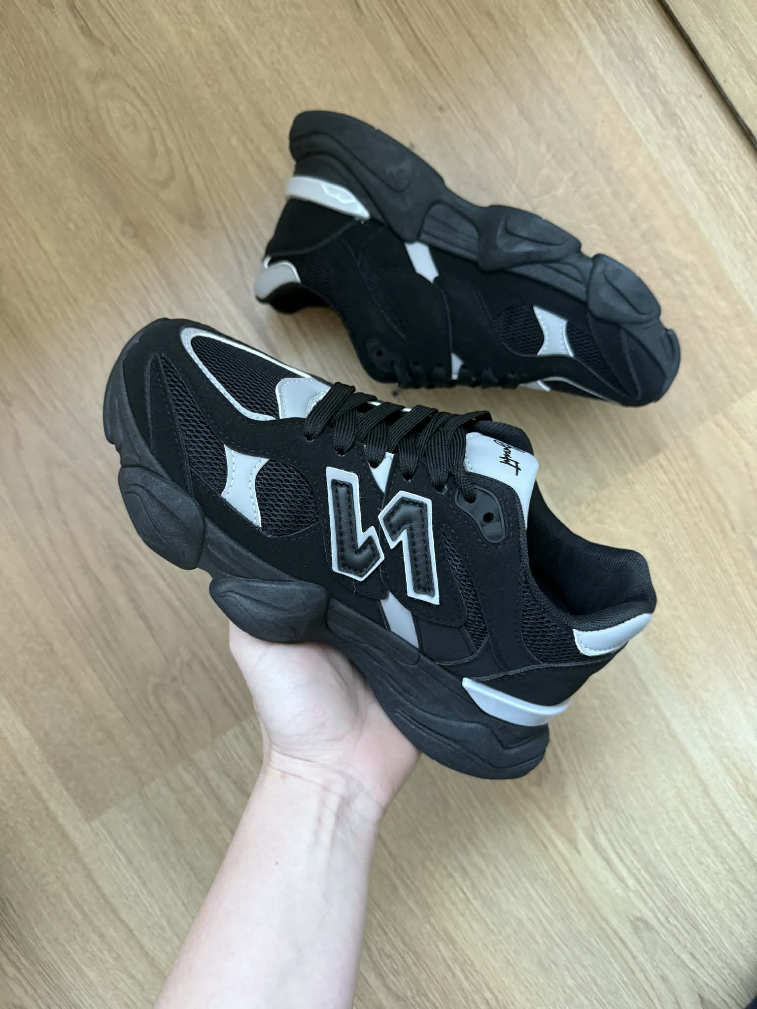 | Kleur: Zwart met grijs. |