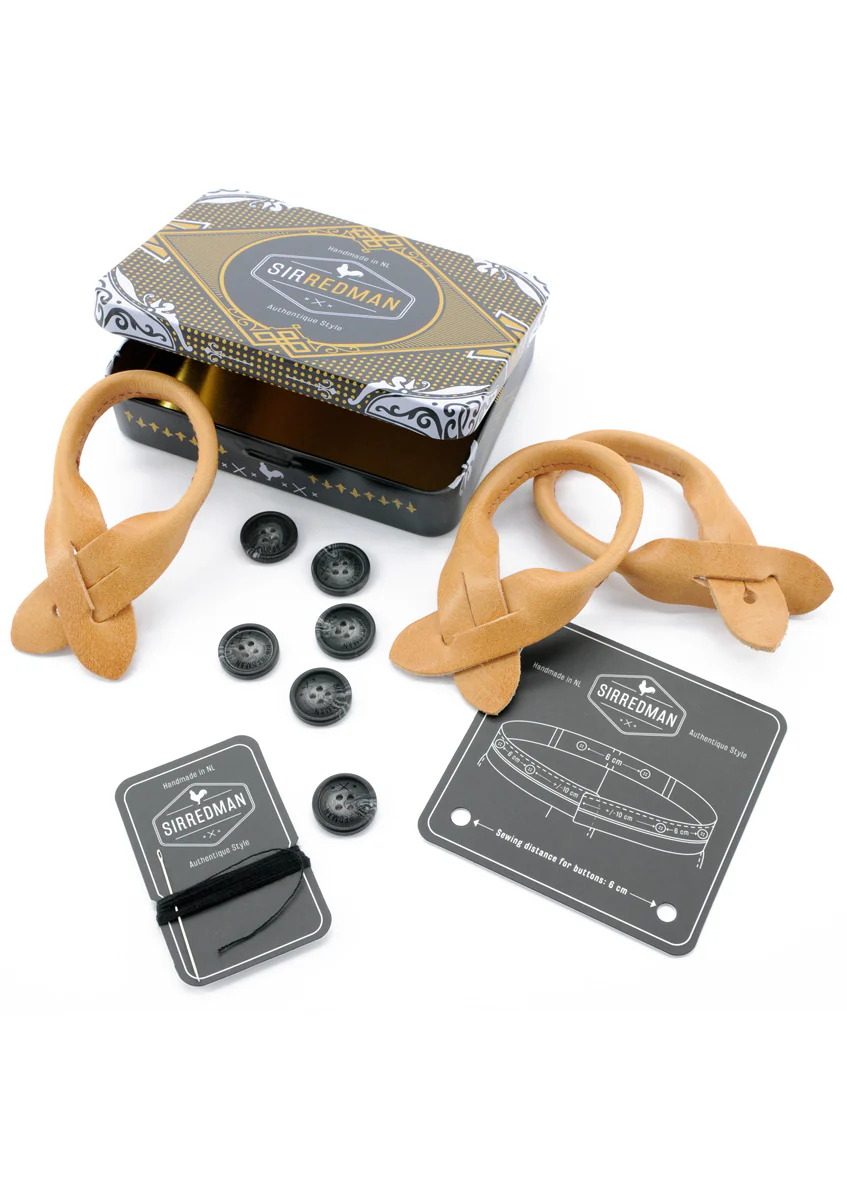 Kies zelf hoe je de bretels draagt. Gebruik de stevige clips voor een snelle bevestiging aan de broekrand, of ga voor de klassieke uitstraling met lederen lussen. Het speciaal meegeleverde blikje bevat zes knopen, naald en draad en een afstandsbepaler. Hiermee kun je de knopen eenvoudig aan de binnenkant van je broek bevestigen, zodat je de bretels op authentieke wijze kunt dragen. Gebruik je de lussen even niet? Bewaar ze in het handige blikje.