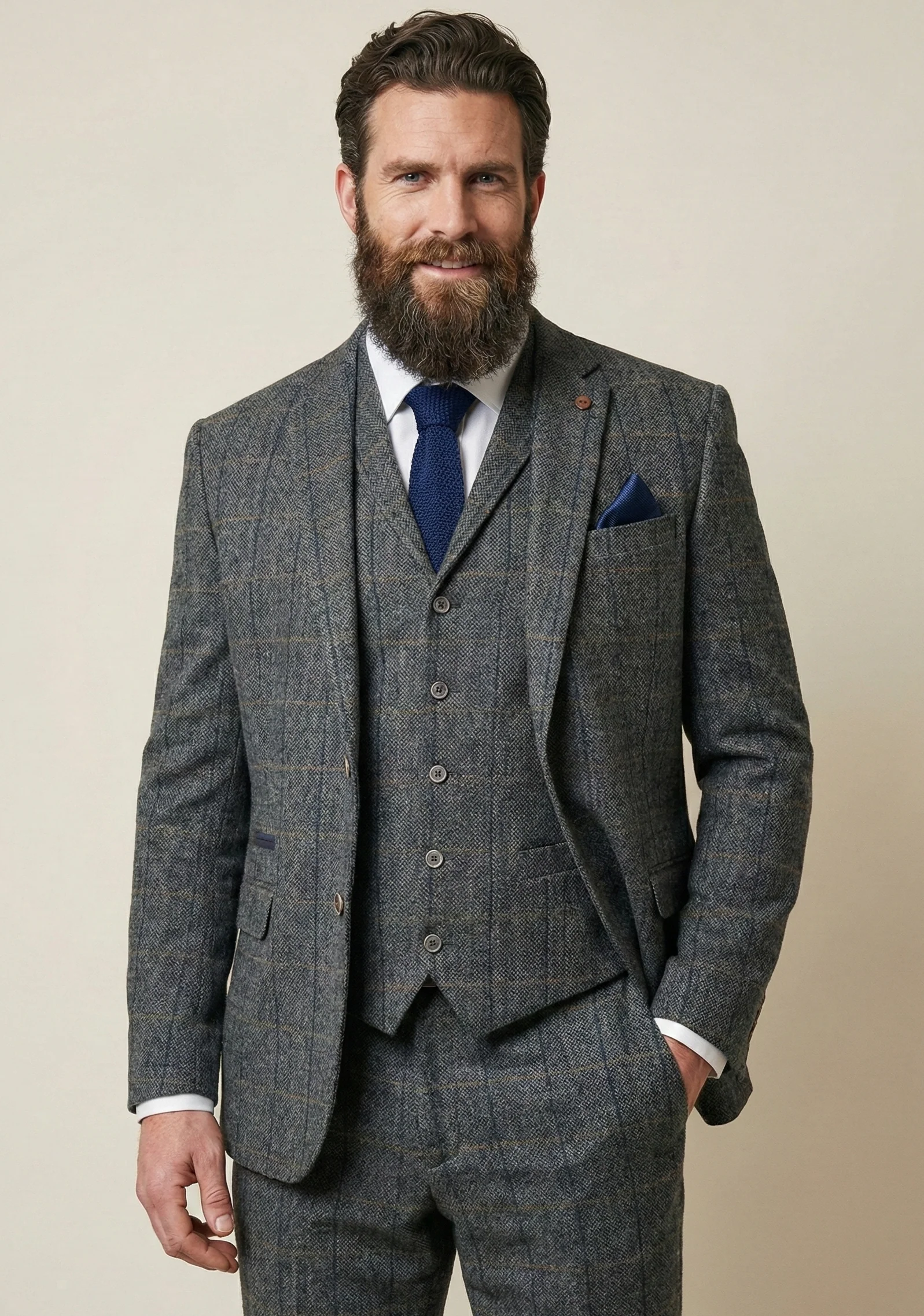 - Compleet met blazer, gilet en broek tweed gestructureerde ruit met contrasterende afwerking. Op maat gemaakt ontwerp (Tussen Slim & Regular Fit)
