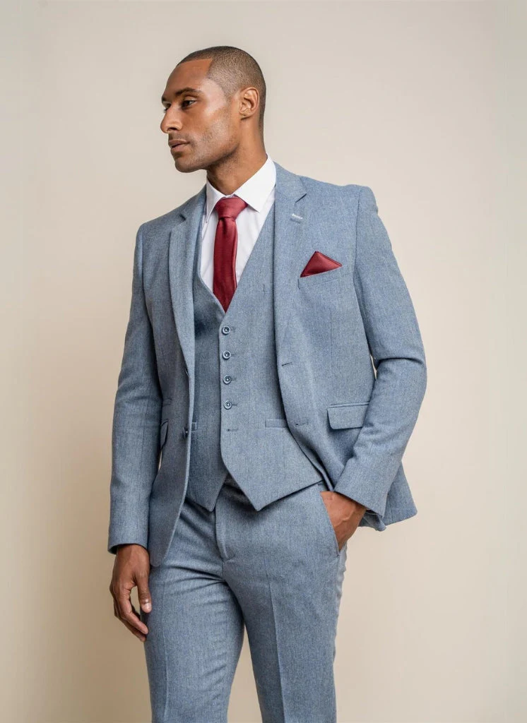 De lichtblauwe kleur van het Wells colbert geeft je een frisse en moderne uitstraling. Het tweedpatroon voegt een subtiele structuur toe, wat het colbert een luxe en verfijnde uitstraling geeft. Het notch lapel is een klassiek detail dat het colbert zijn formele uitstraling geeft. Het double back vent zorgt voor extra bewegingsvrijheid, ideaal voor een actieve levensstijl. De blauwe knopen vormen een elegant accent dat perfect past bij de kleur van het colbert.