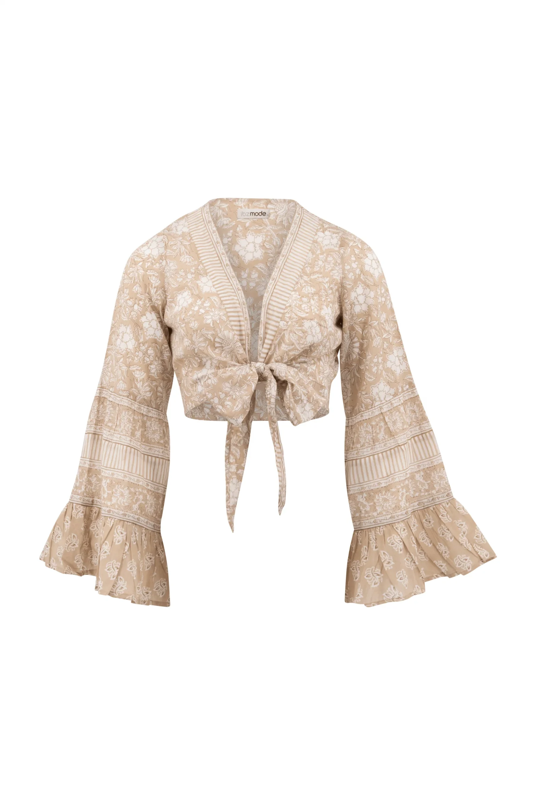 Deze Crop Top Flair Jesenia Natural van ibzmode in het natural ademt Ibiza vibes. Wikkeltop met vrolijke print en flair mouwen Draag het met je favoriete accessoires voor een echte brands of Ibiza-look. Shop nu bij ibizamode en straal deze zomer in stijl.