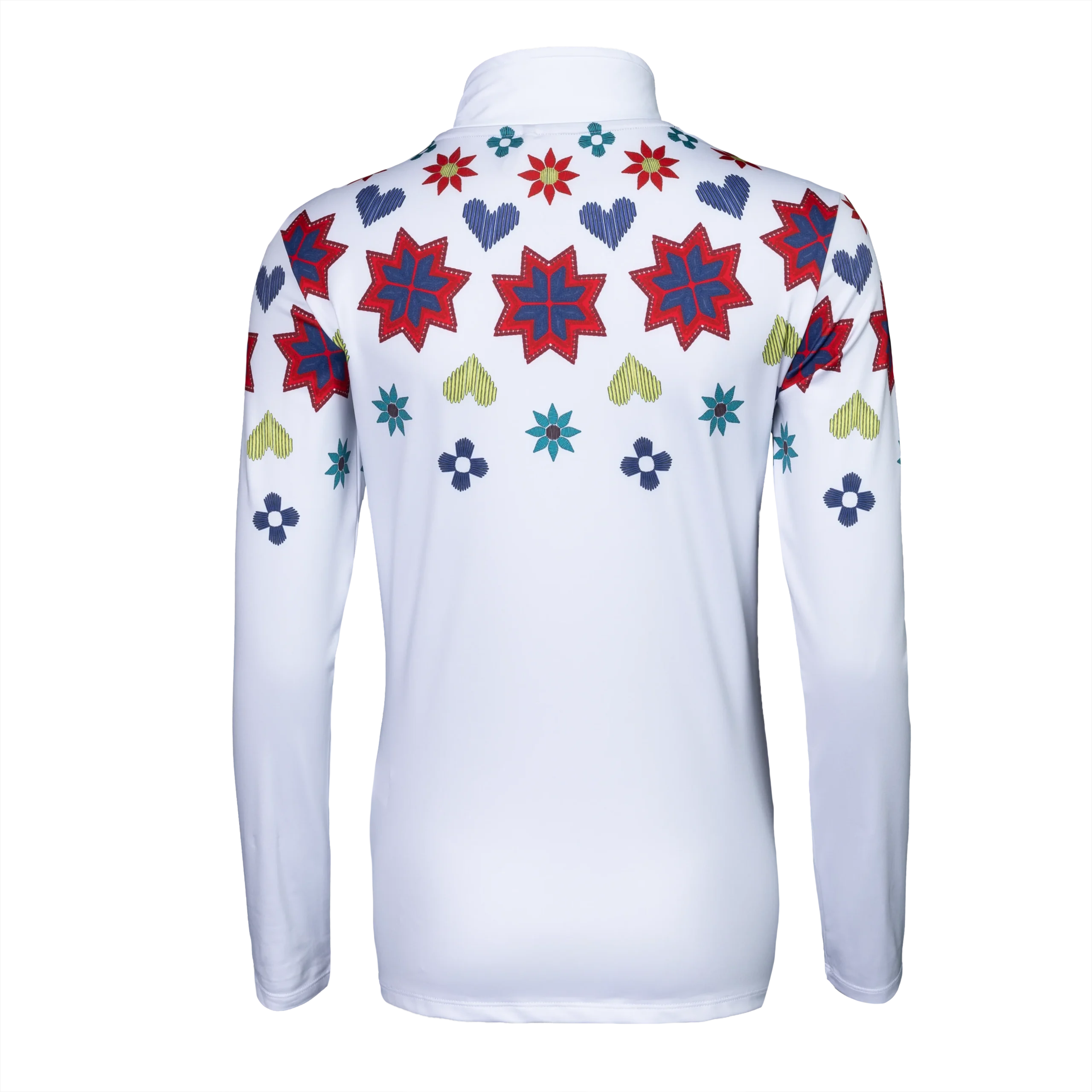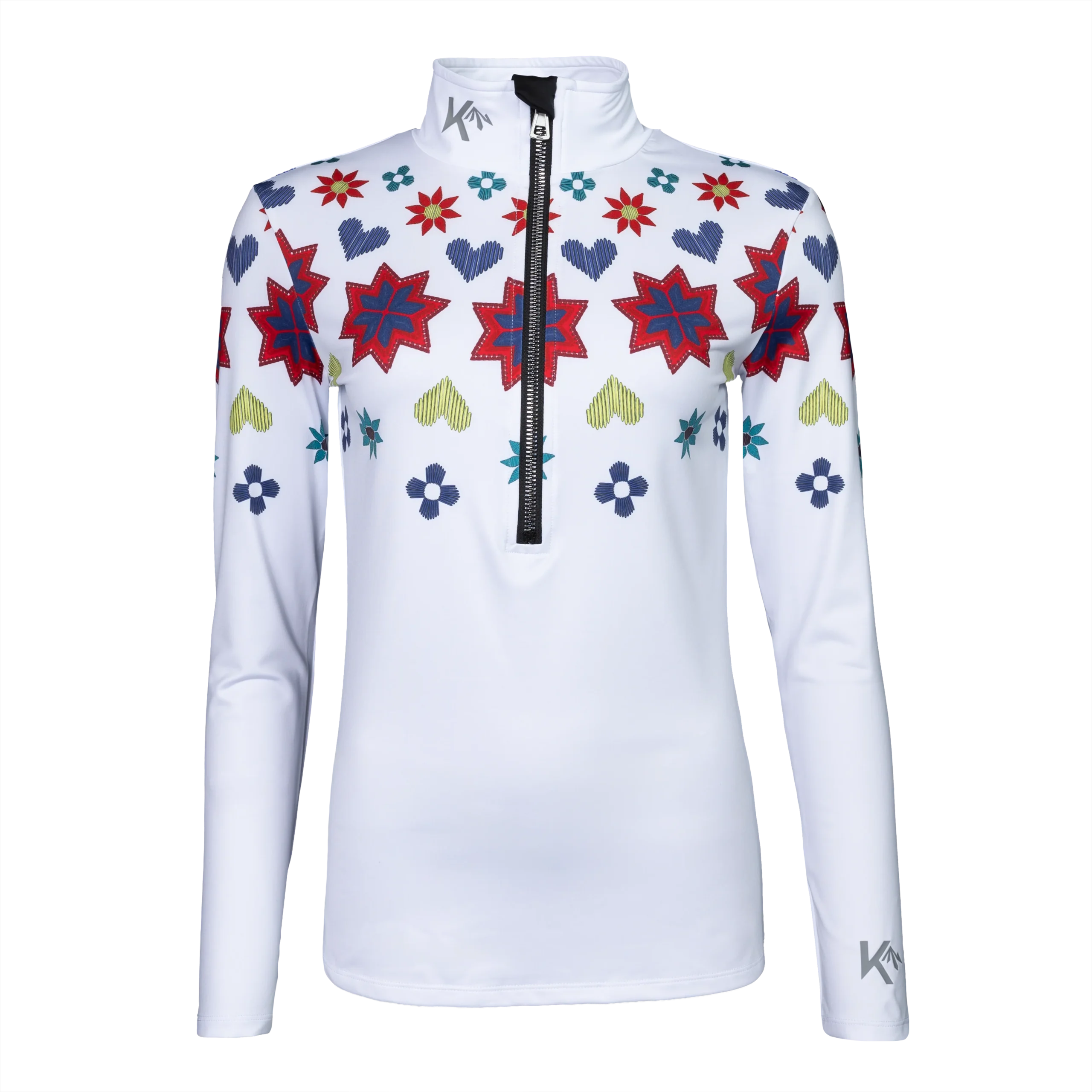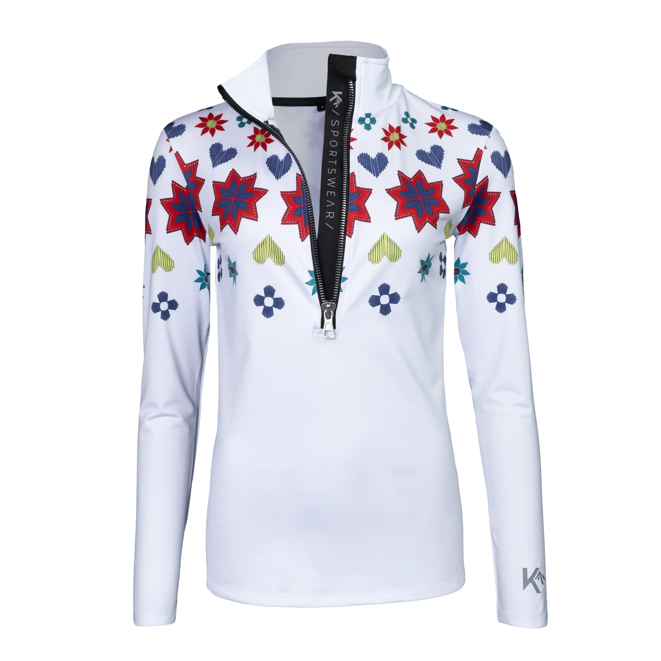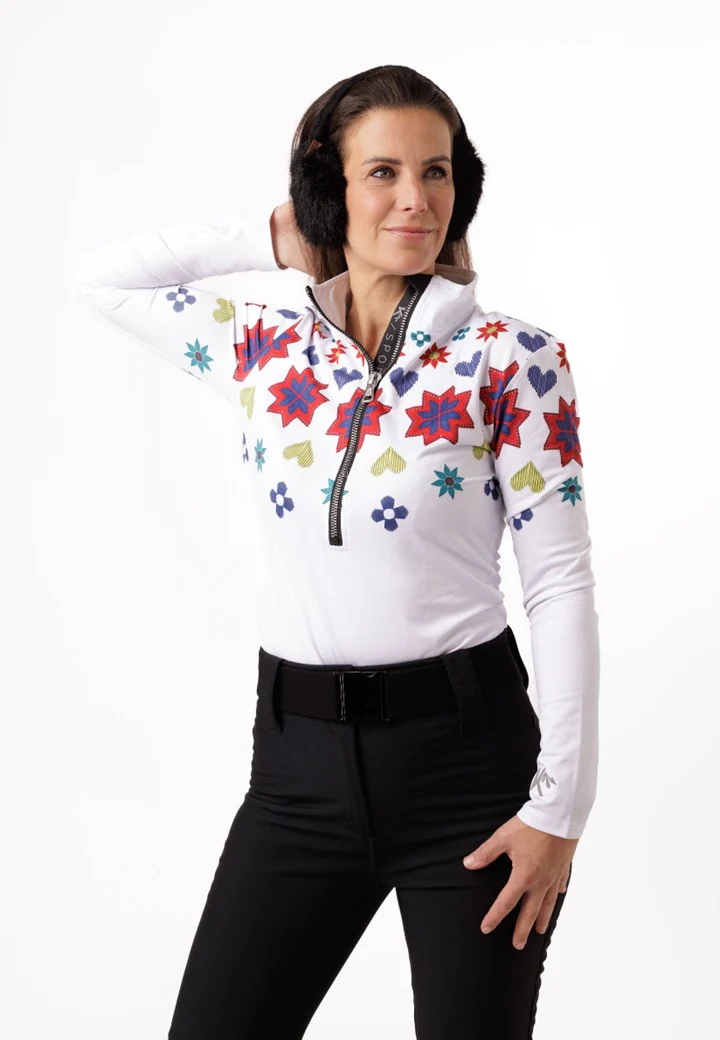 Deze Midlayer / Pully is geïnspireerd op het poolgebied met een Scandinavische print die eruitziet alsof hij geborduurd is. Het getailleerde model biedt een perfecte warme en comfortabele laag onder je ski-jas. De zilveren rits maakt de pully stoer en chic tegelijk. Open heeft de trui een extra vleugje detail: hij is comfortabel op een terras of in een bar, want de rits kan wijd open en de col zorgt ervoor dat elk item dat je erover draagt comfortabel en warm aanvoelt in de nek.