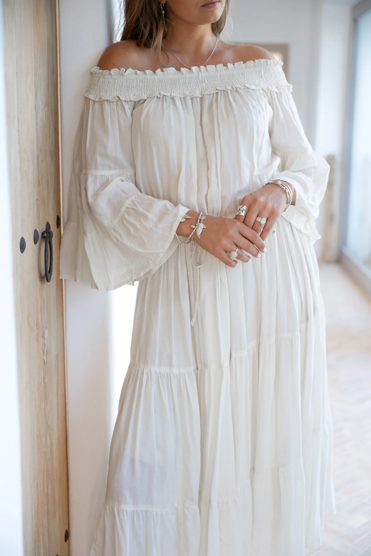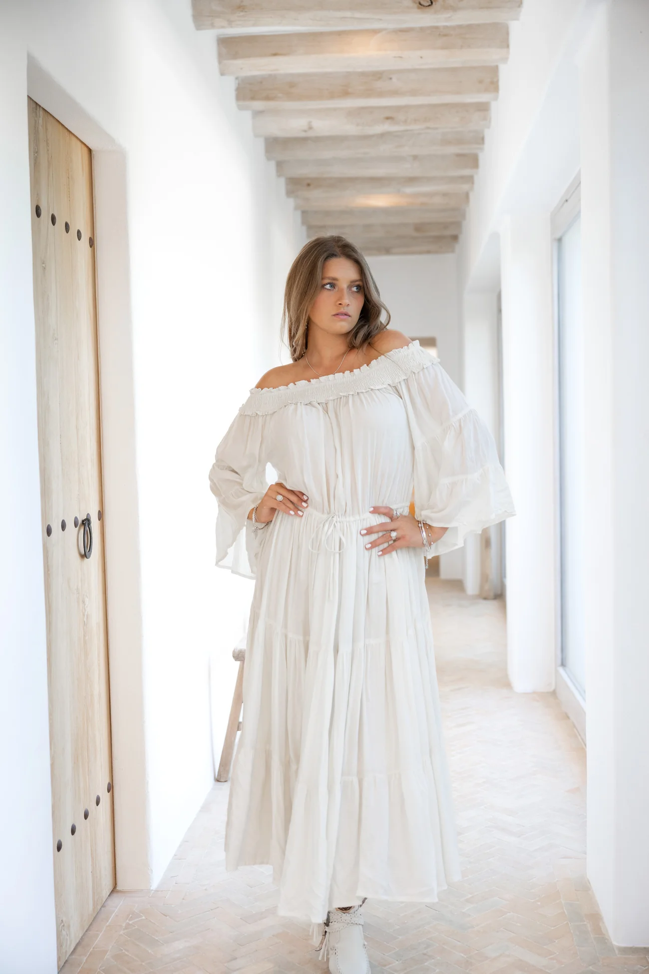 Creëer jouw ultieme zomerse look met de Dress Jamee Boho Ecru in de kleur ecru. Off shoulder model, elastische band in de hals, flare mouwen, kan naar wens in de taille gestrikt wo Draag het met je favoriete accessoires voor een echte brands of Ibiza-look. Bestel snel en geniet van de bohemian lifestyle, elke dag opnieuw.