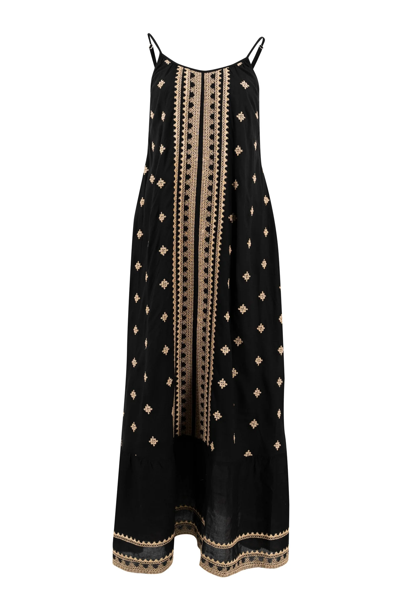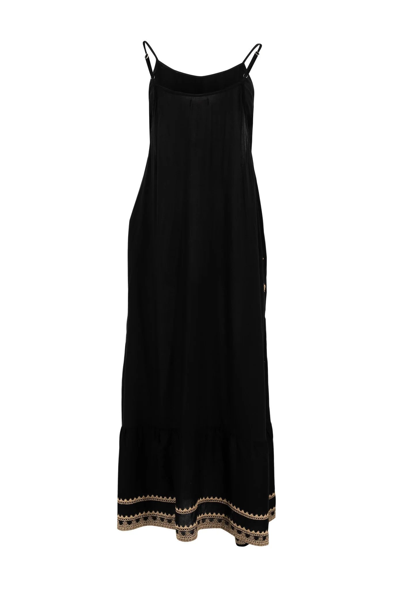Deze Dress Mina Black van ibzmode in het black ademt Ibiza vibes. Bewerkt met gouden borduurwerk, verstelbare spaghettibandjes, heeft zakken aan de zijkant, loopt wij Perfect te combineren met slippers, een basic top of een lichte blouse. Voeg deze must-have toe aan je zomergarderobe.
