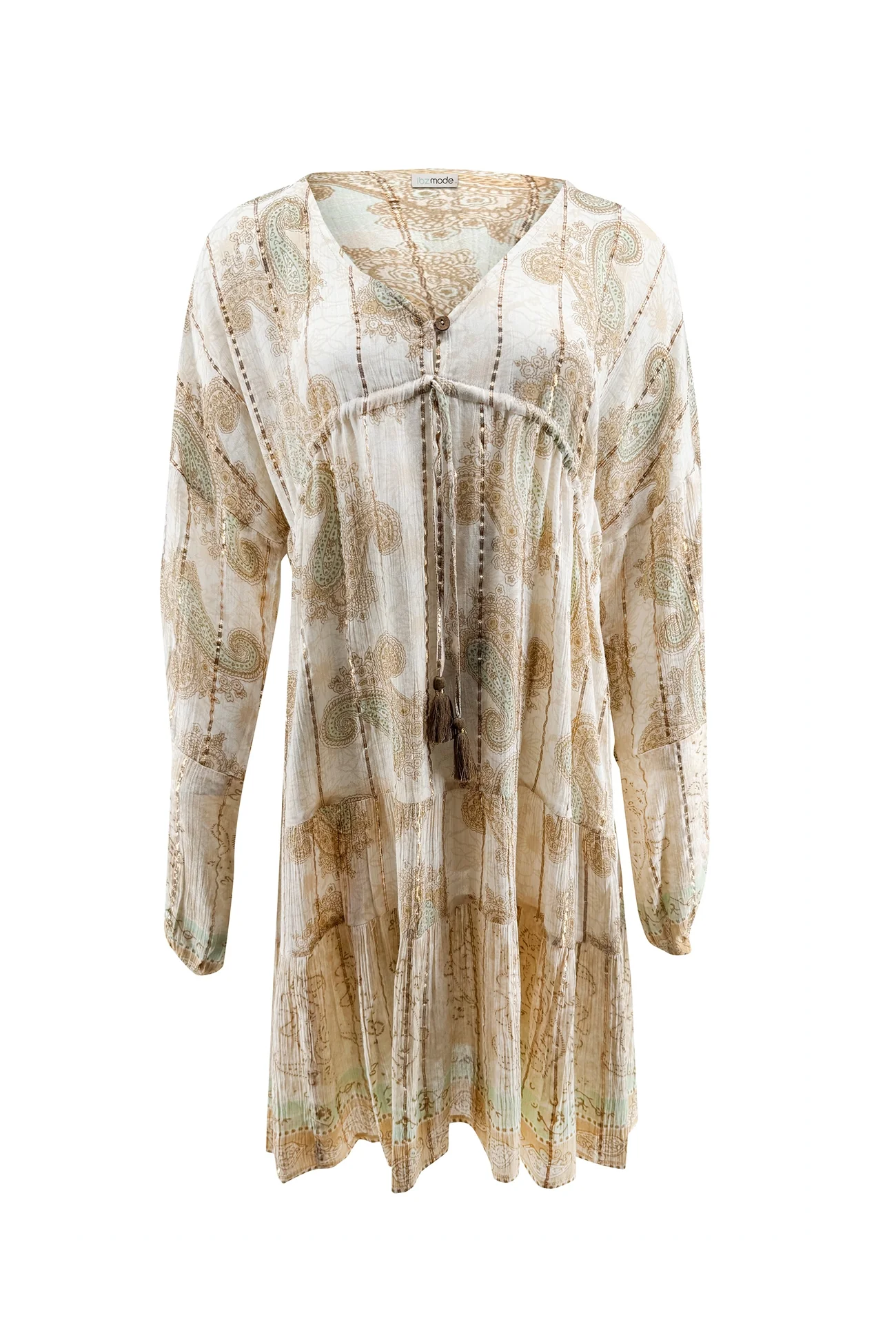 De Dress Mio Solmira Ivory paisley jurk straalt warmte en zachtheid uit binnen de Golden Glow collectie van ibzmode. De rijke paisley print krijgt extra diepte door een subtiele gouden sparkle die het zonlicht vangt bij elke beweging. Dat zorgt voor een natuurlijke glow zonder overheersend te zijn.