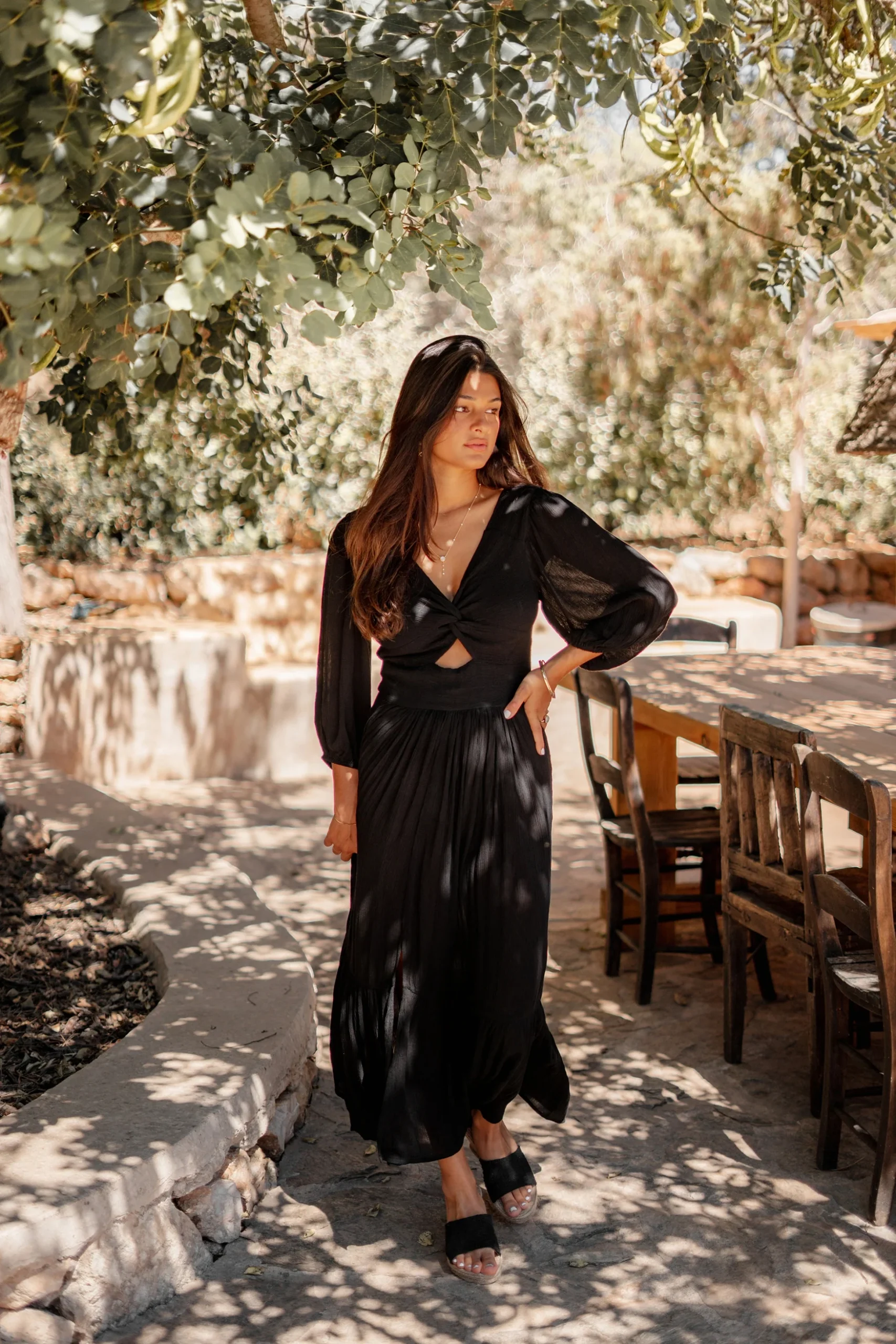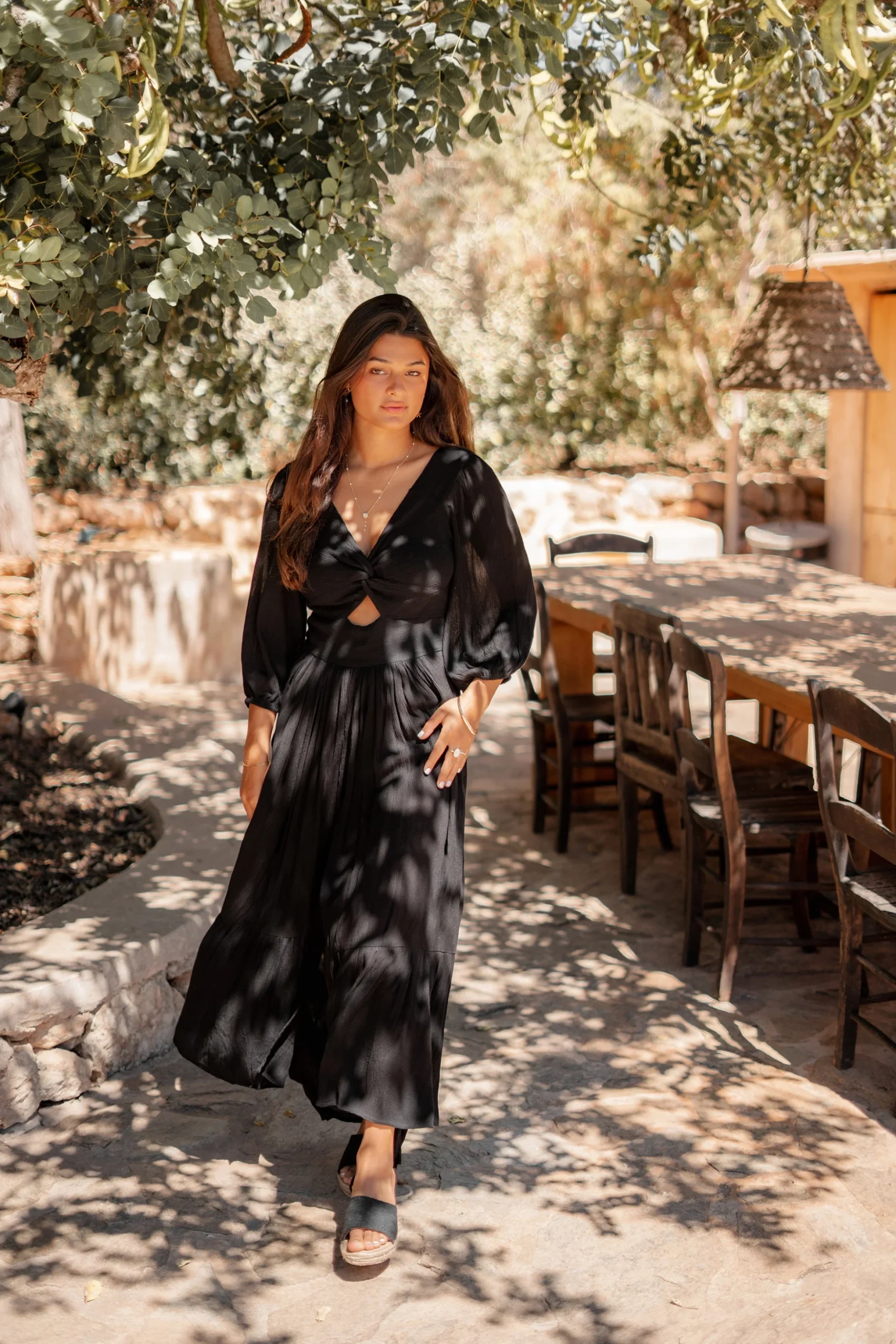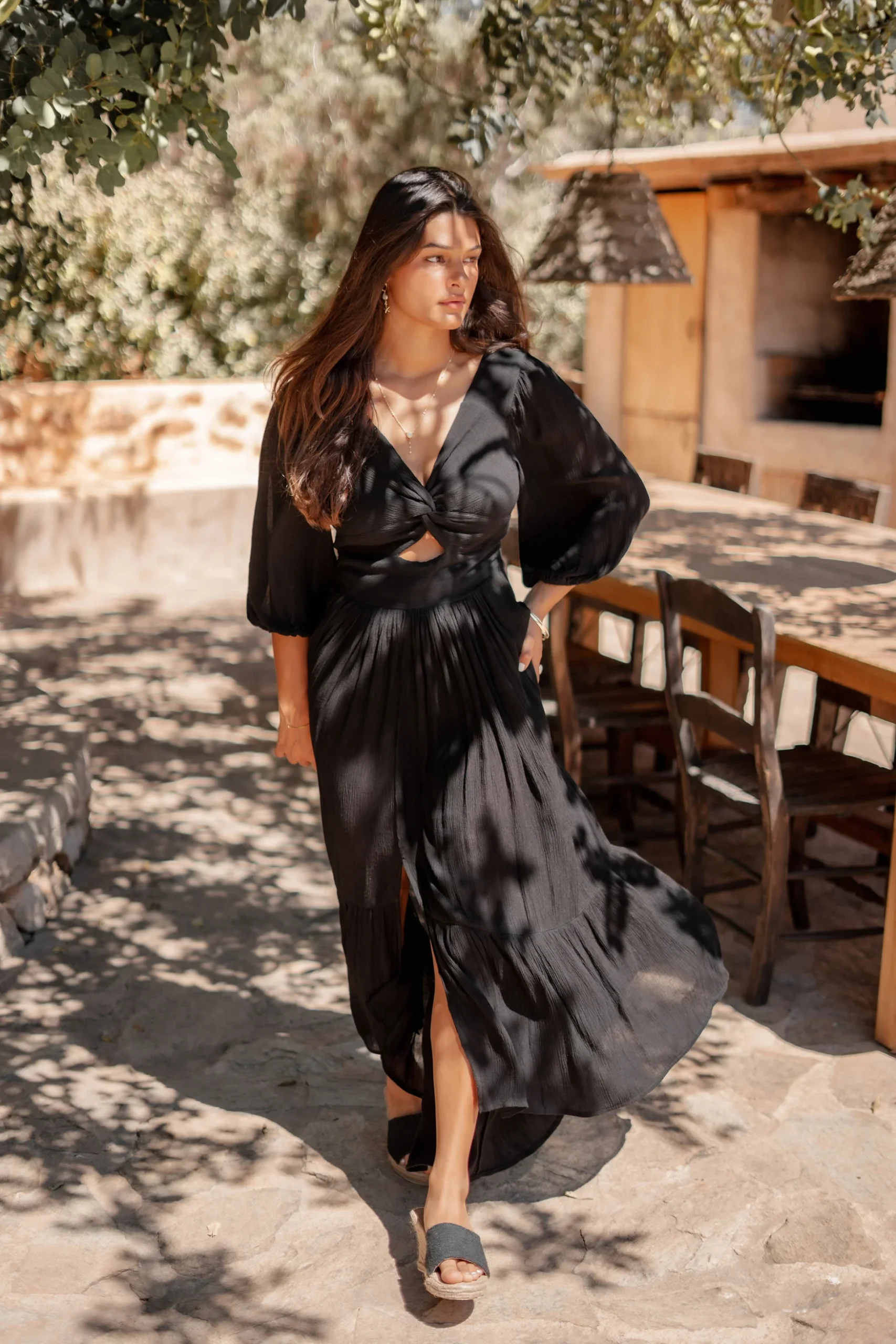 Deze Dress Santi Black van ibzmode in het black ademt Ibiza vibes. Lange jurk met een gedraaid detail aan de voorkant, heeft een stretch band op de rug, pofmouwen met Het natuurlijke materiaal zorgt voor een luchtige feel. Nu verkrijgbaar bij ibizamode – ontdek meer op Brands of Ibiza.