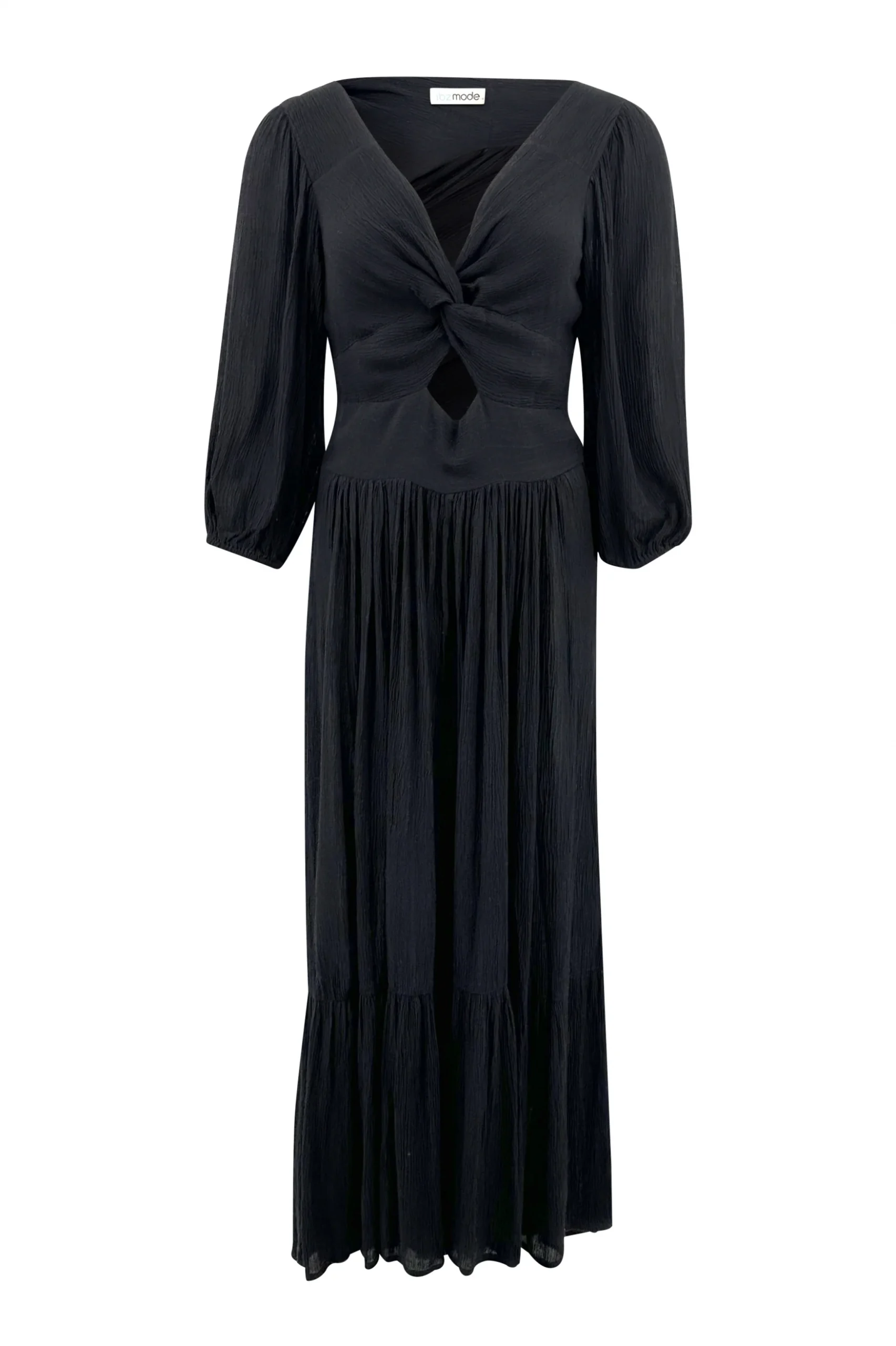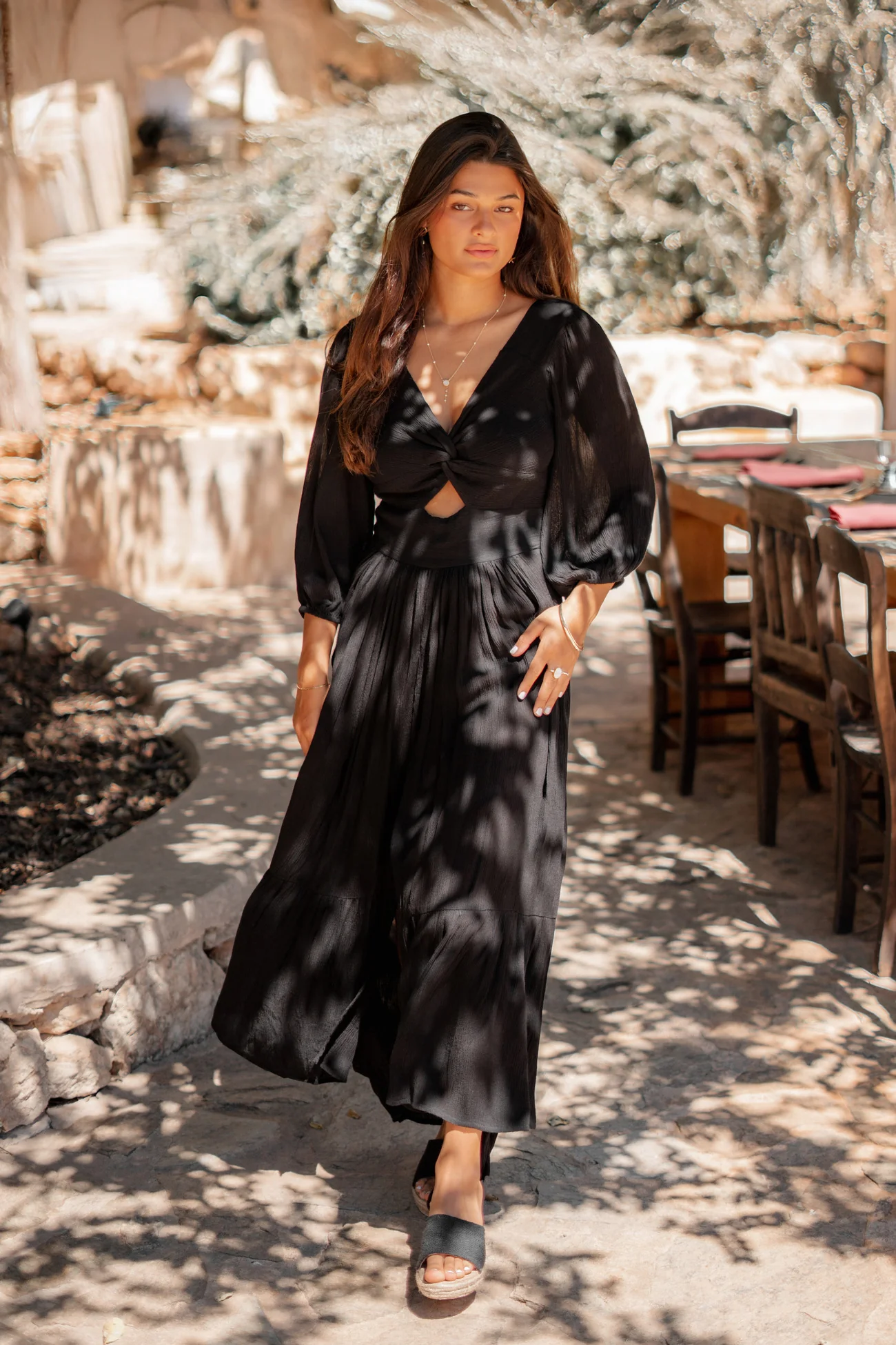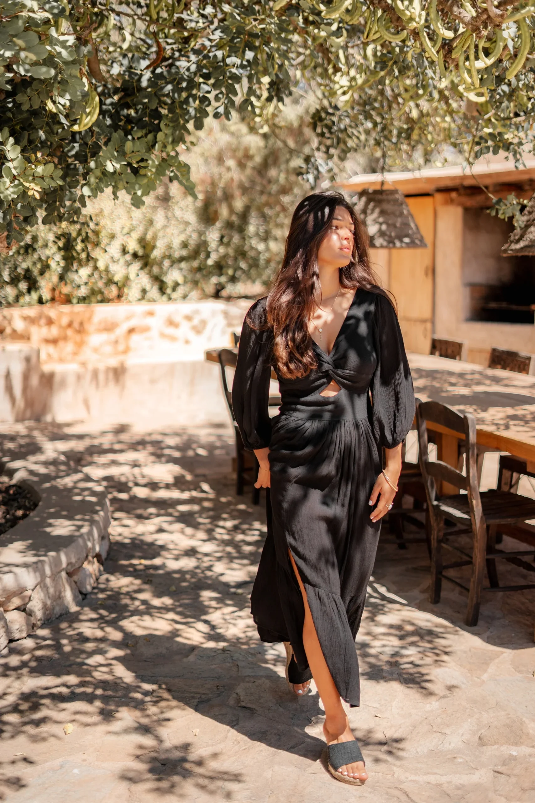 Deze Dress Santi Black van ibzmode in het black ademt Ibiza vibes. Lange jurk met een gedraaid detail aan de voorkant, heeft een stretch band op de rug, pofmouwen met Het natuurlijke materiaal zorgt voor een luchtige feel. Nu verkrijgbaar bij ibizamode – ontdek meer op Brands of Ibiza.