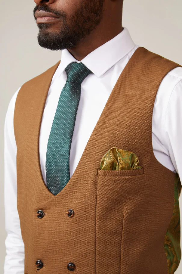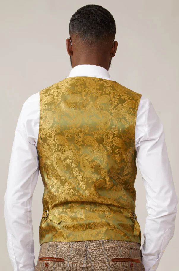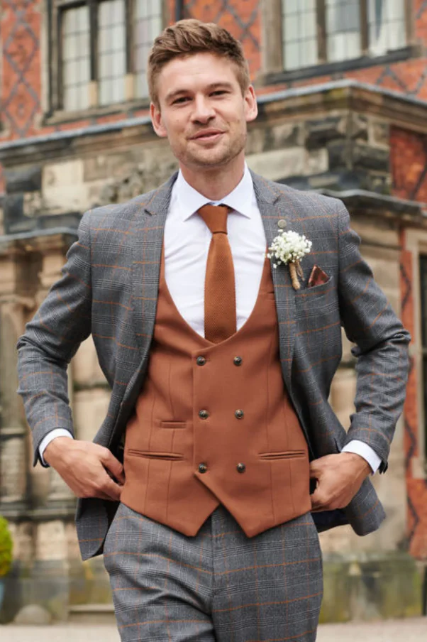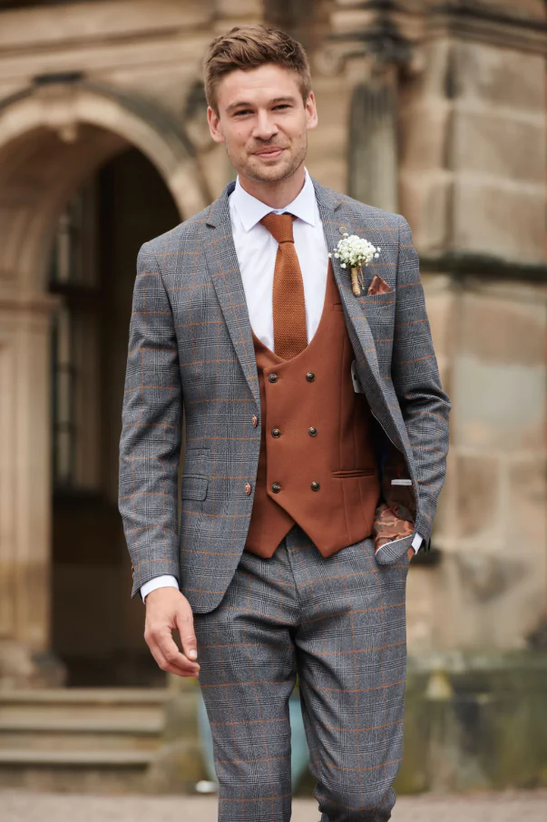Een geruite blazer en pantalon in fraaie grijze tint met tan gilet is uitstekend voor deze zomer maar is ook goed te dragen in de winter. Vul het ensemble aan met een stropdas of vlinderdas in bijpassende kleur en het geheel is compleet.