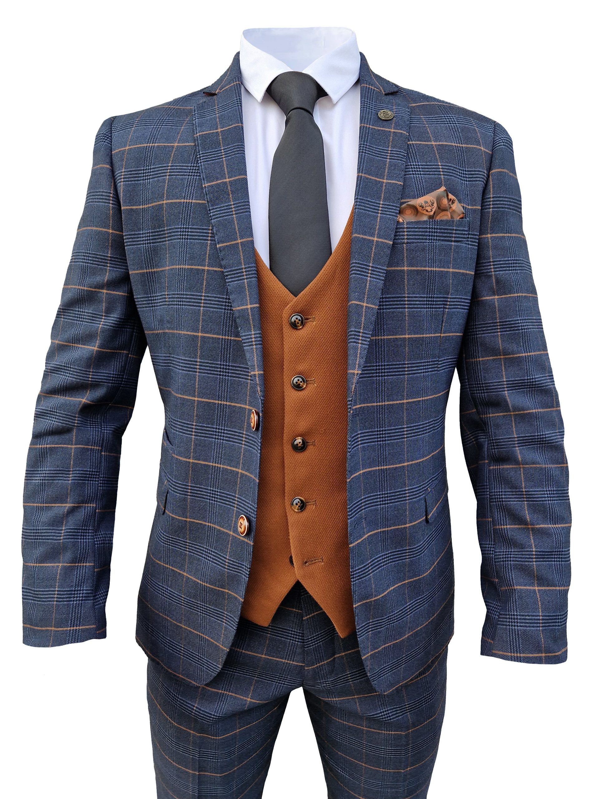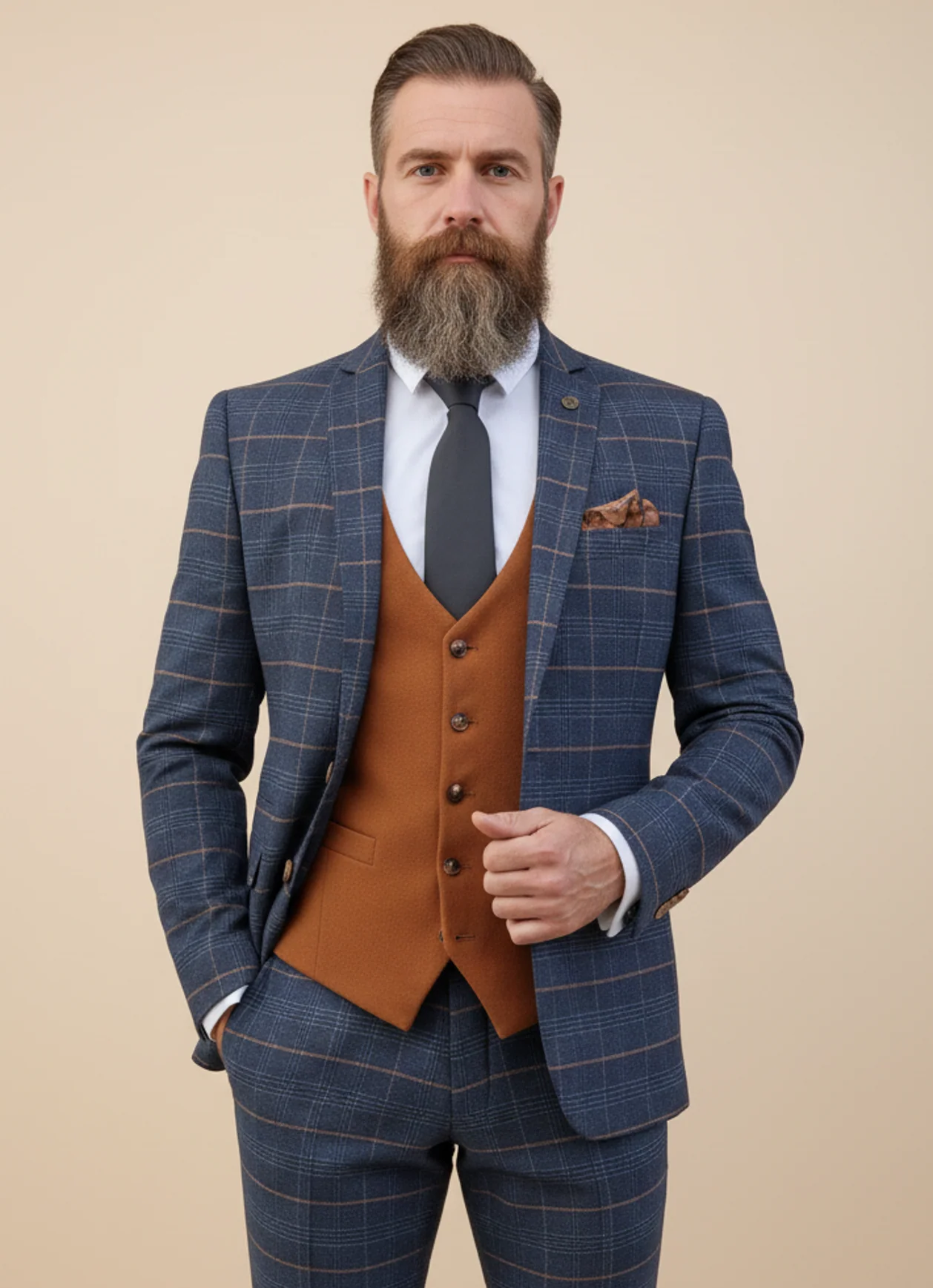 Focus op het gilet: double breasted, net dat tikje extra flair onder je colbert. De double back vent? Bewegingsvrijheid zonder in te leveren op uitstraling. Notch lapel, stijlvolle bruin getinte knopen – de kleine dingen die grote indruk maken. Dit is vakmanschap, geen routinewerk. Elk detail is gekozen om je te laten opvallen, zonder ooit over de top te gaan.