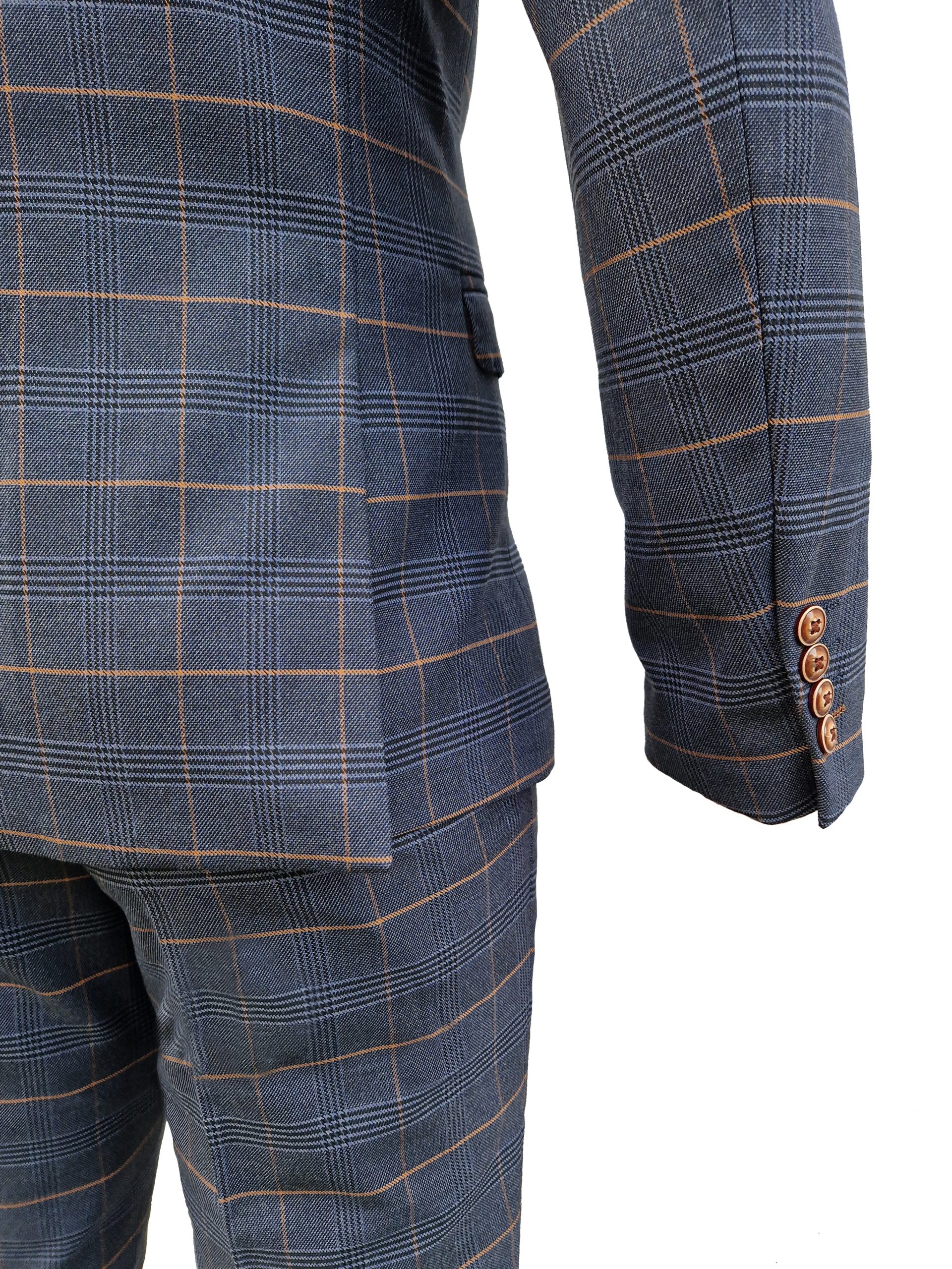 Dit is geen pak voor een enkele bruiloft of dat ene feestje. Dit is je dagelijkse geheime wapen. De diepe marineblauwe kleur en het geraffineerde ruitmotief geven je zakelijke uitstraling een boost. Je loopt de boardroom binnen en de atmosfeer verandert. Combineer het met een wit overhemd, een gedurfd pochet, klassieke manchetknopen. Jij maakt de regels. Jij bent het voorbeeld.