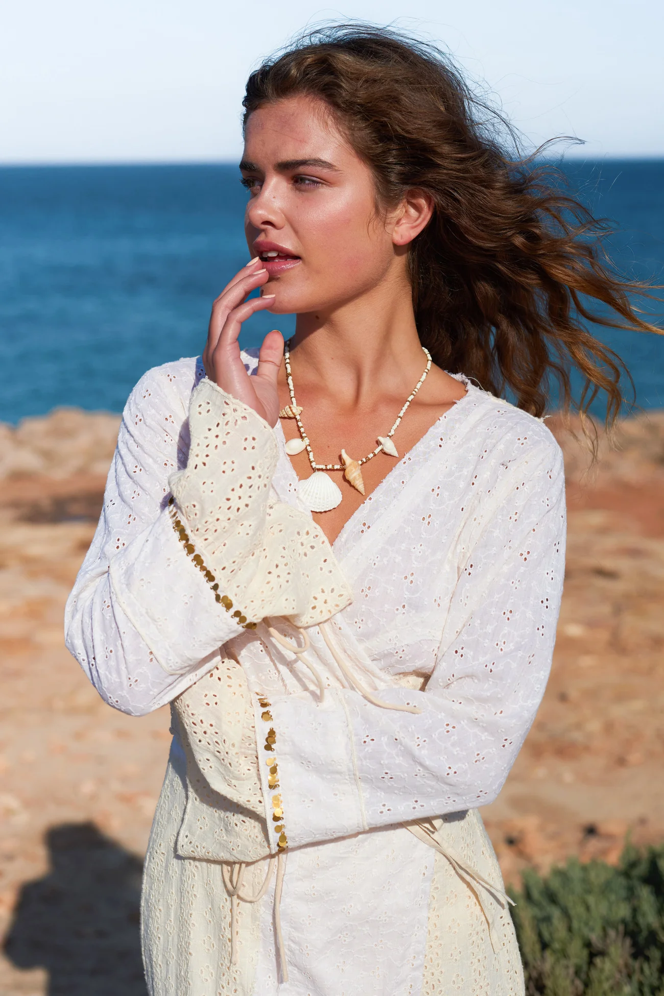 Creëer jouw ultieme zomerse look met de Embroidered Long Dress Fantasy Cream in de kleur cream. Lange jurk met lange mouwen, de top is overslag, broderie stof bestaat uit verschillende stukken Draag het met je favoriete accessoires voor een echte brands of Ibiza-look. Laat de zomer maar komen – jij bent er klaar voor.