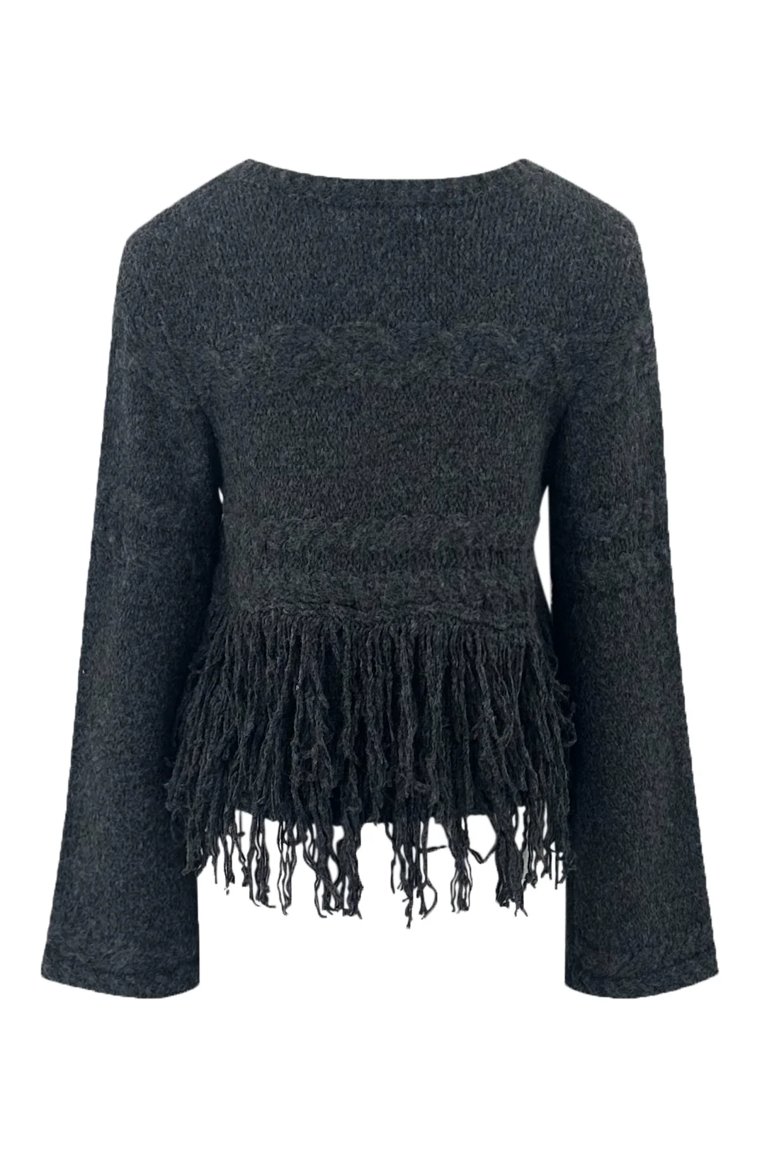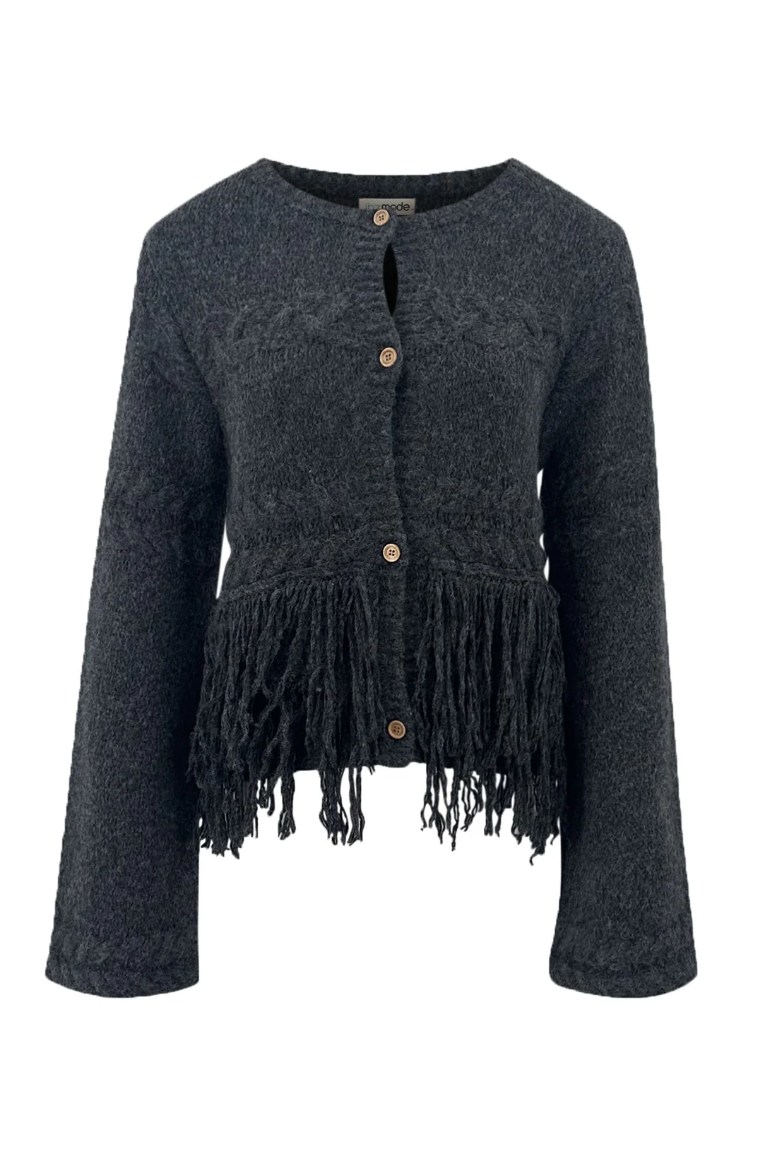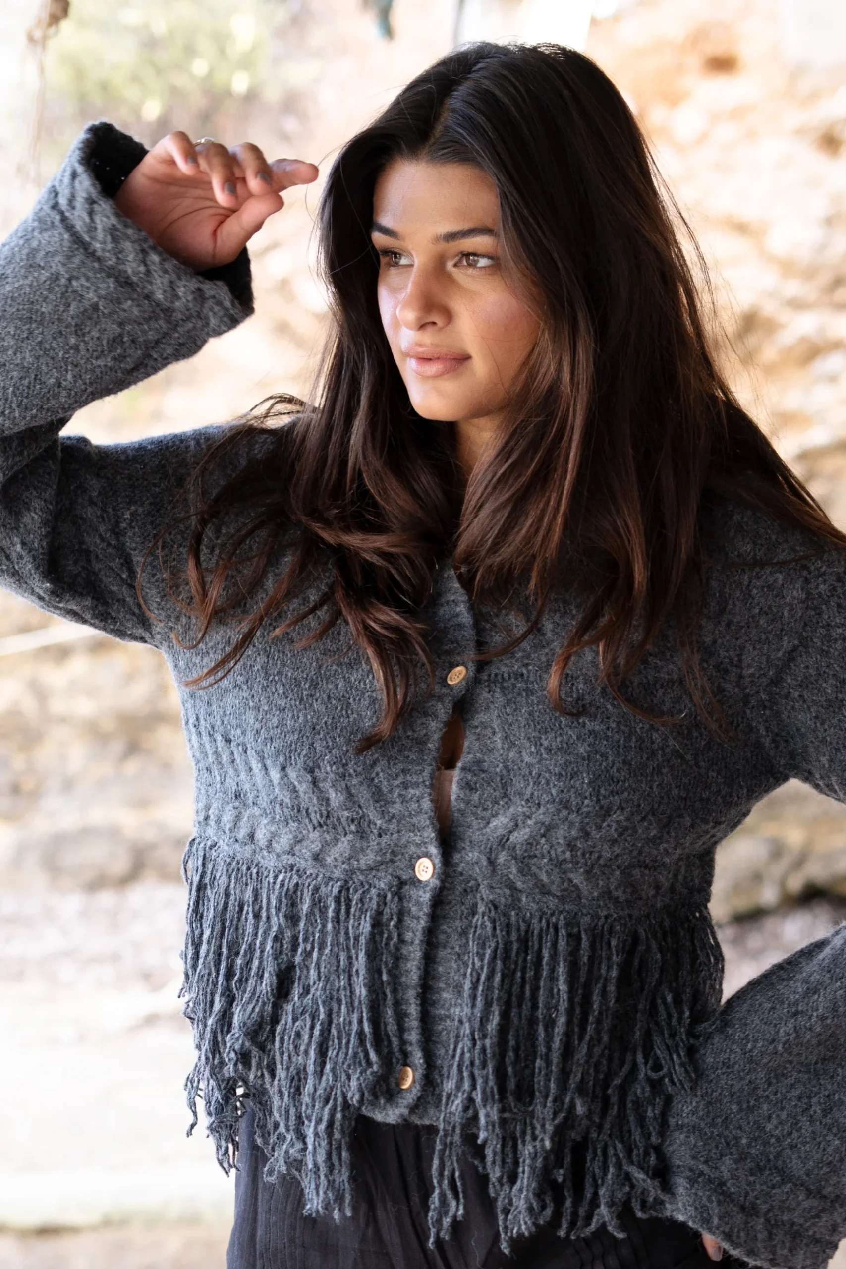 Deze Fringe Jacket Daira Dark Grey van ibzmode in het black ademt Ibiza vibes. Fijn gebreid vestje met franjes, sluit met houten knopen Laat de zomer maar komen – jij bent er klaar voor.