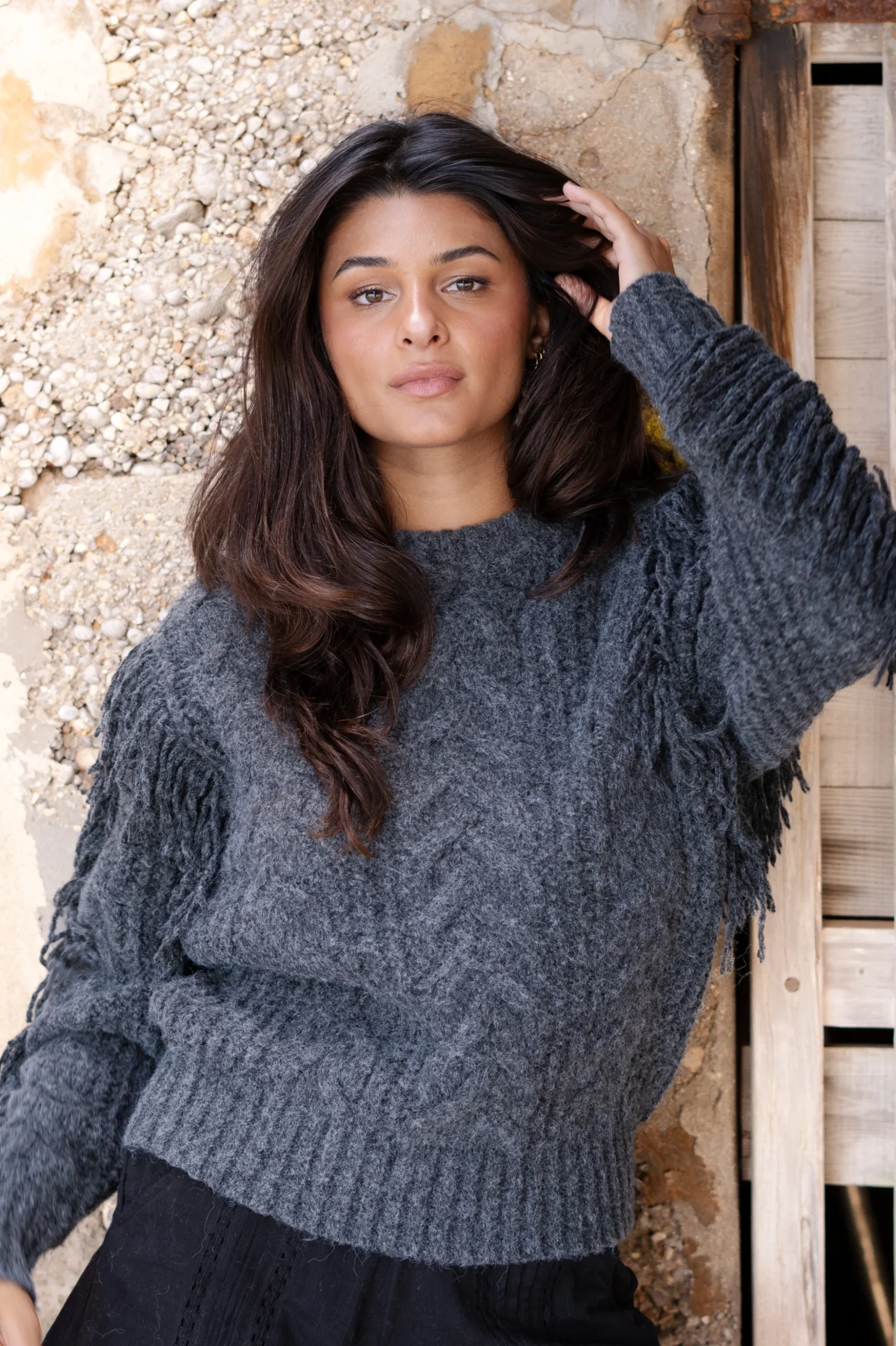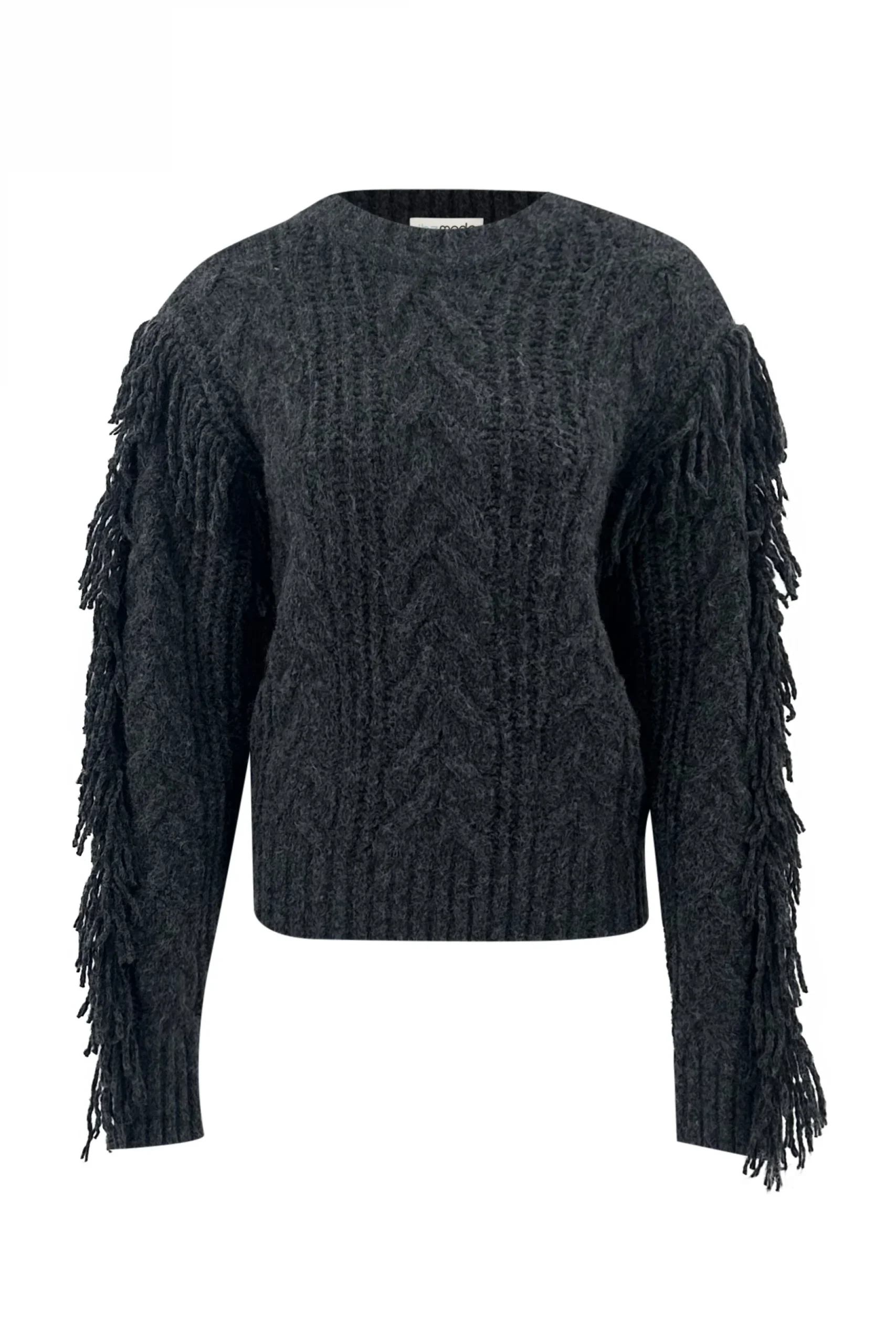 Creëer jouw ultieme zomerse look met de Fringe Pullover Dago Dark Grey in de kleur black. Kabeltrui met een hoge hals, bewerkt met franjes Perfect te combineren met slippers, een basic top of een lichte blouse. Shop nu bij ibizamode en straal deze zomer in stijl.