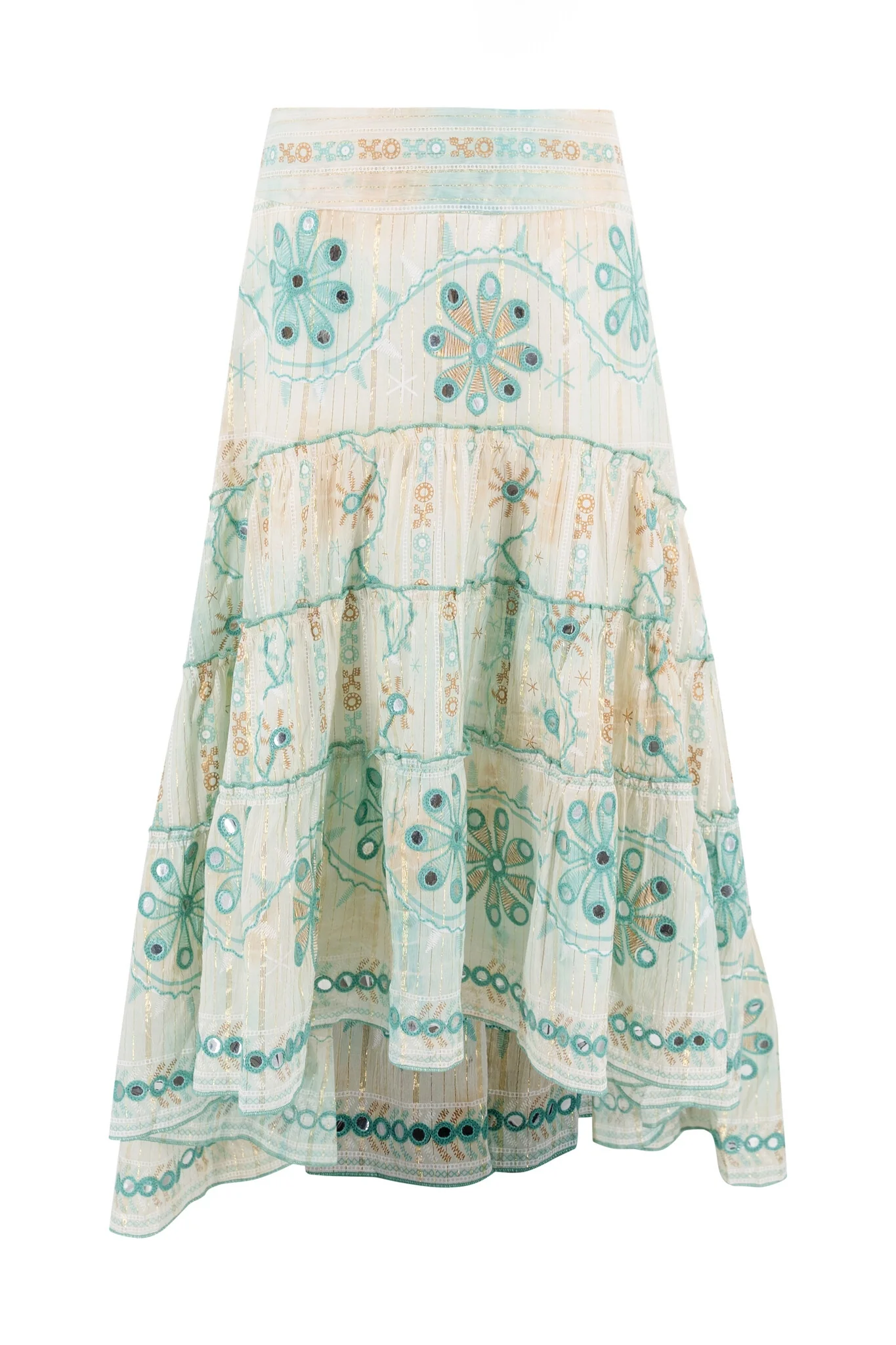 Met de Gypsy Skirt Mirror Aqua van ibzmode ben je klaar voor elke summer getaway. Elastisch in de taille, de achterkant valt langer, ruche lagen, bewerkt met sierspiegeltjes De luchtige stof voelt zacht aan op je huid. Voeg deze must-have toe aan je zomergarderobe.