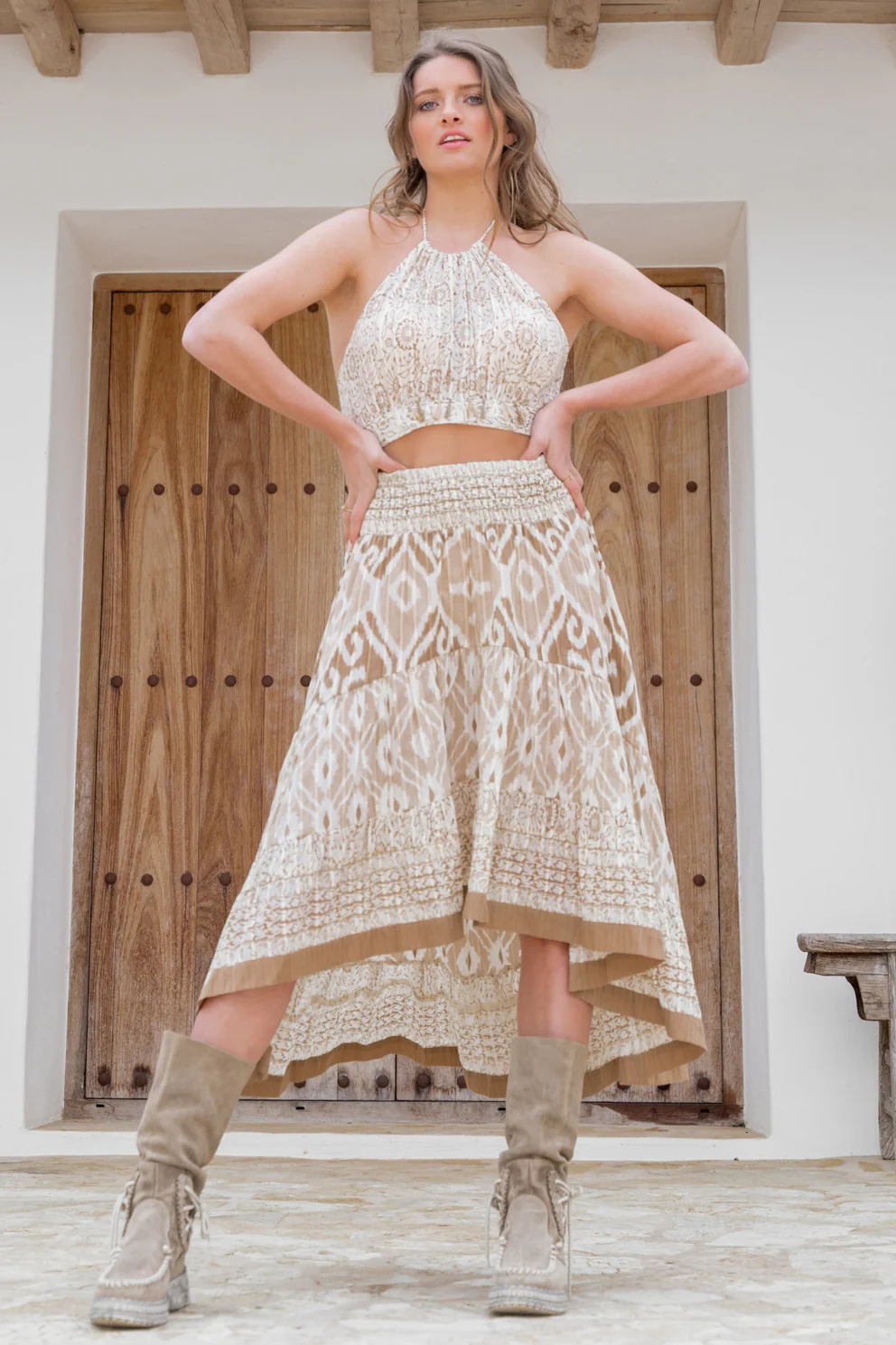 Deze Gypsy Skirt Rafa Natural van ibzmode in het natural ademt Ibiza vibes. Brede elastische band in de taille, valt langer aan de achterkant, heeft ruche lagen, bewerkt met gl Draag het met je favoriete accessoires voor een echte brands of Ibiza-look. Shop nu bij ibizamode en straal deze zomer in stijl.