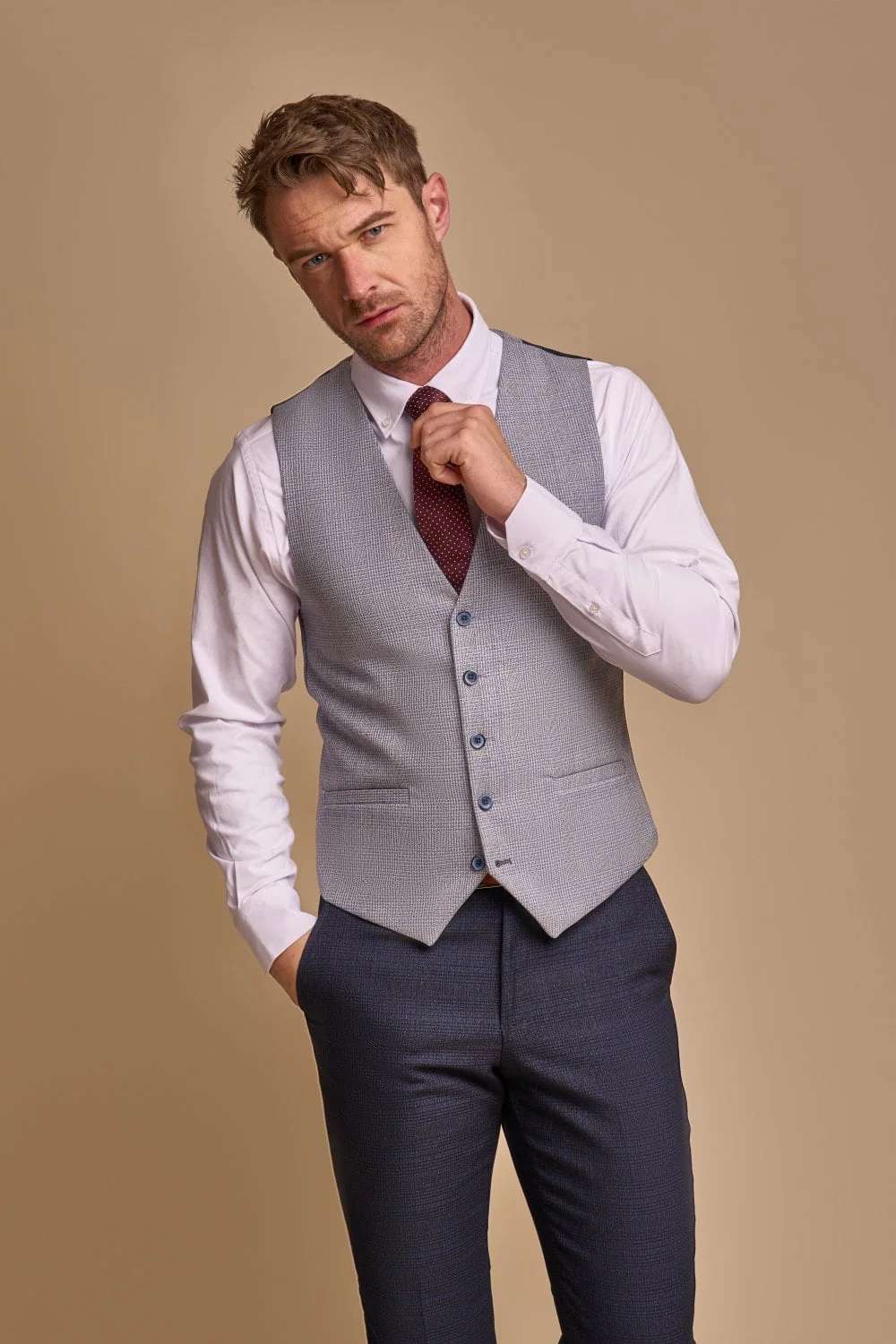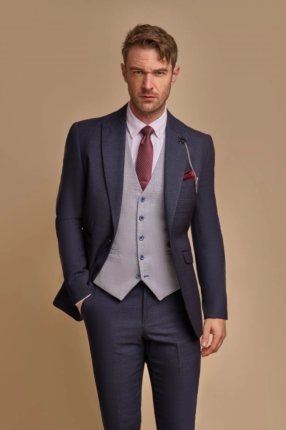 Waarom dit heren pak in navy blauw en sky blauw gilet?