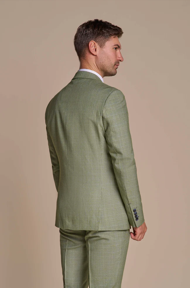 Dit is het statement waar stijlvolle mannen deze zomer voor kiezen: het driedelig sage green kostuum van Cavani Caridi. Geen standaard donkerblauw of saai grijs, maar een kleur met karakter — zacht, volwassen, veelzijdig. Sage green laat zich moeiteloos aanpassen aan het moment. Overdag straalt het kostuum frisheid, licht en energie uit. Zodra de zon zakt, krijgt de groene tint meer diepte, meer verfijning. Een subtiele ruitstructuur geeft het geheel een levendig ritme.