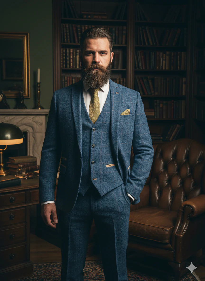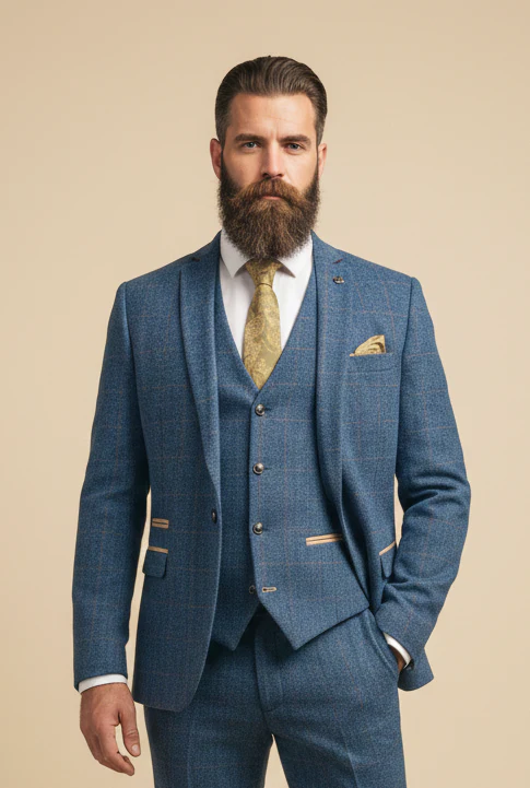 Er zijn pakken die je draagt, en er zijn pakken die jou dragen. Het Dion Blue Herringbone valt zonder twijfel in de tweede categorie. Niet alleen vanwege het opvallend elegante visgraatpatroon, maar ook door de uitgebalanceerde combinatie van Engelse charme en moderne snit. Dit is geen pak dat je zomaar aantrekt. Dit is een pak dat je aantrekt op het moment dat je indruk wilt maken, herinneringen wilt creëren — en misschien wel een stukje geschiedenis wilt schrijven. Of het nu je trouwdag is, een chique feestavond in een club aan de Theems, of een bijzondere zakelijke gelegenheid, dit pak zet de toon.