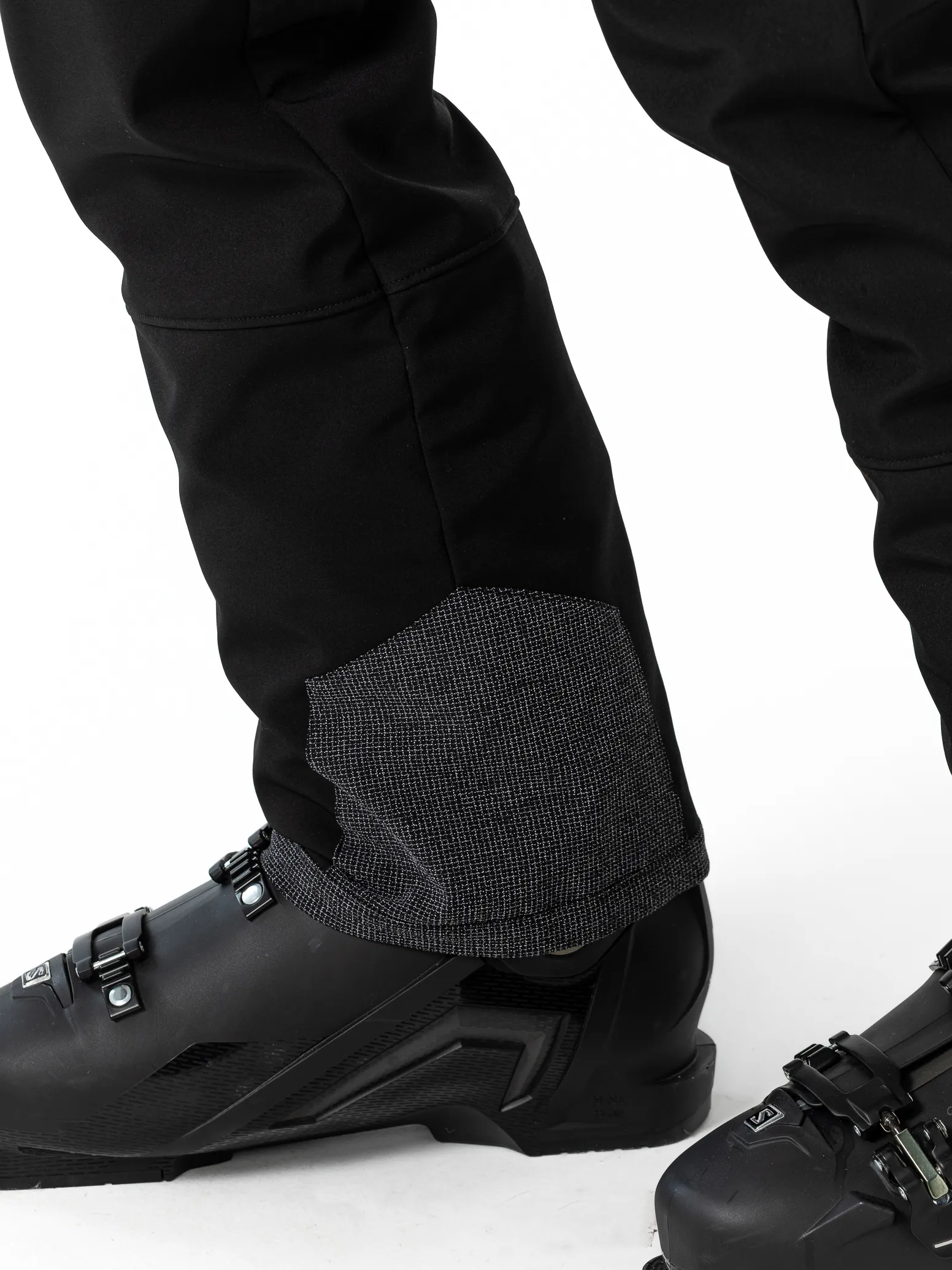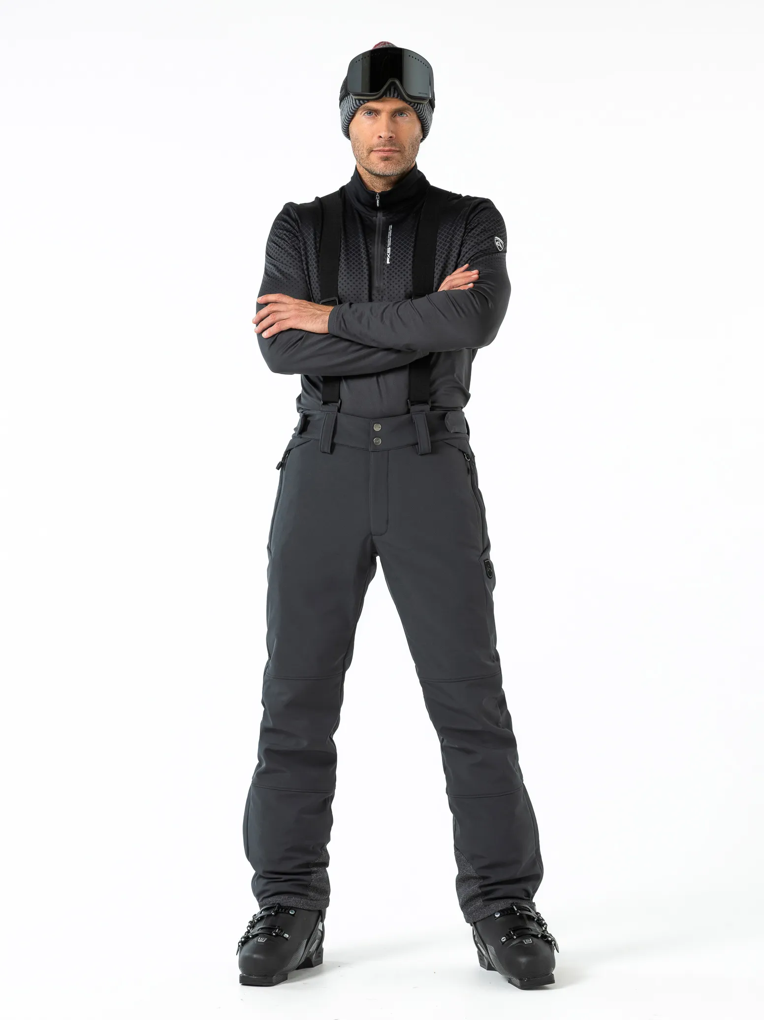 Comfortabele heren skibroek van waterdichte, ademende softshell in de kleur phantom. De tailleband is verstelbaar en de bretels zijn afneembaar voor extra flexibiliteit. Deze broek is voorzien van enkelritsen die het aan- en uittrekken makkelijker maken. Onderaan de pijpen zit extra versteviging en aan de binnenkant zitten sneeuwmanchetten.