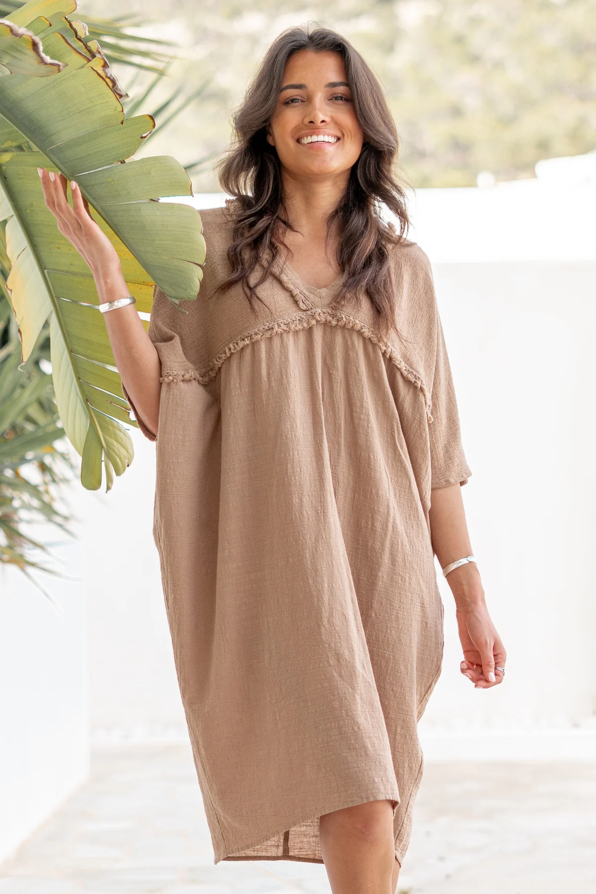 Creëer jouw ultieme zomerse look met de Kaftan Lio Brown in de kleur brown. Heeft een V-hals, afgewerkt met een gerafelde rand, wijde mouwen, fijne kwaliteit linnen stof, draag Draag het met je favoriete accessoires voor een echte brands of Ibiza-look. Laat de zomer maar komen – jij bent er klaar voor.