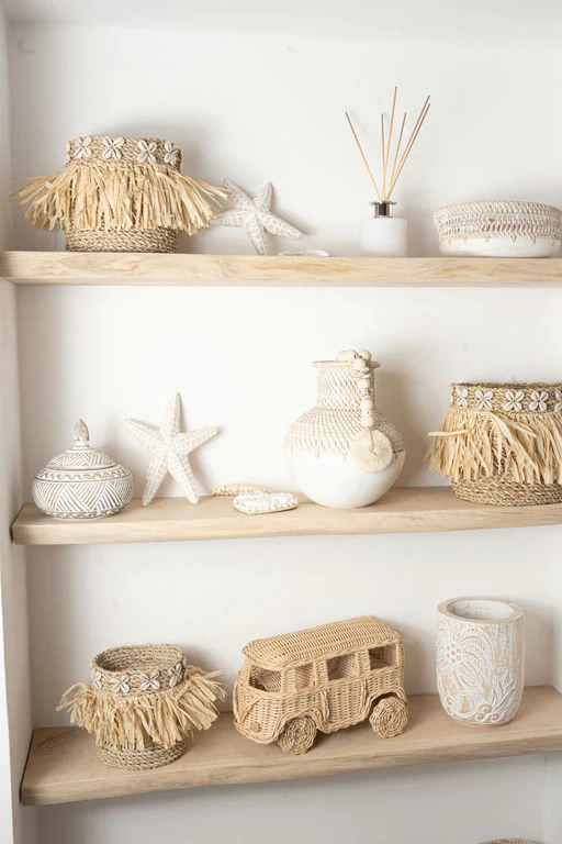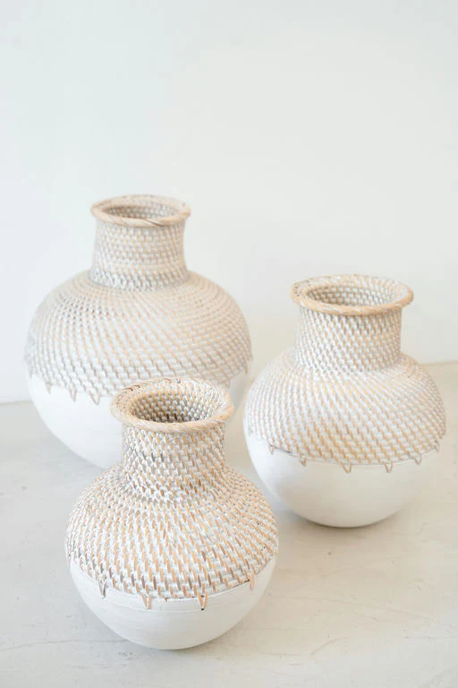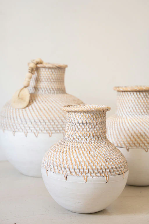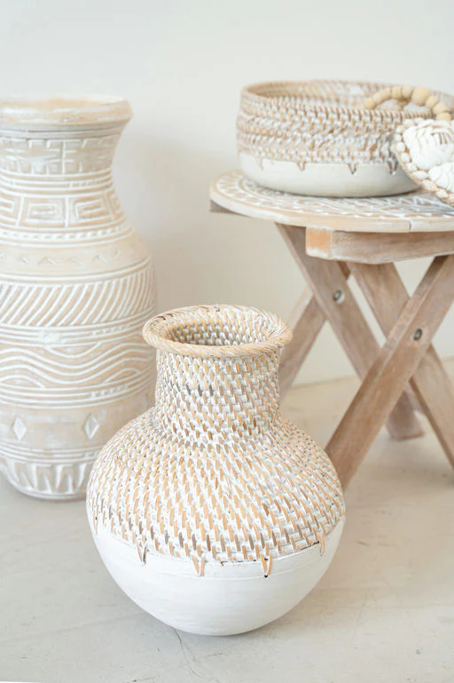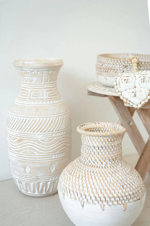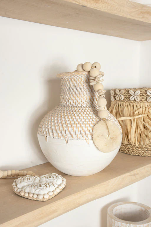 De Vase Kayu Off White geeft je interieur een stijlvolle touch van het eilandleven. Handgemaakt in Bali, gemaakt van rotan en hout, verkrijgbaar in 3 maten Gemaakt van in de kleur off white. Perfect om te mixen met manden, plaids of rotan accessoires. Shop nu en geef je huis een zonnige update.