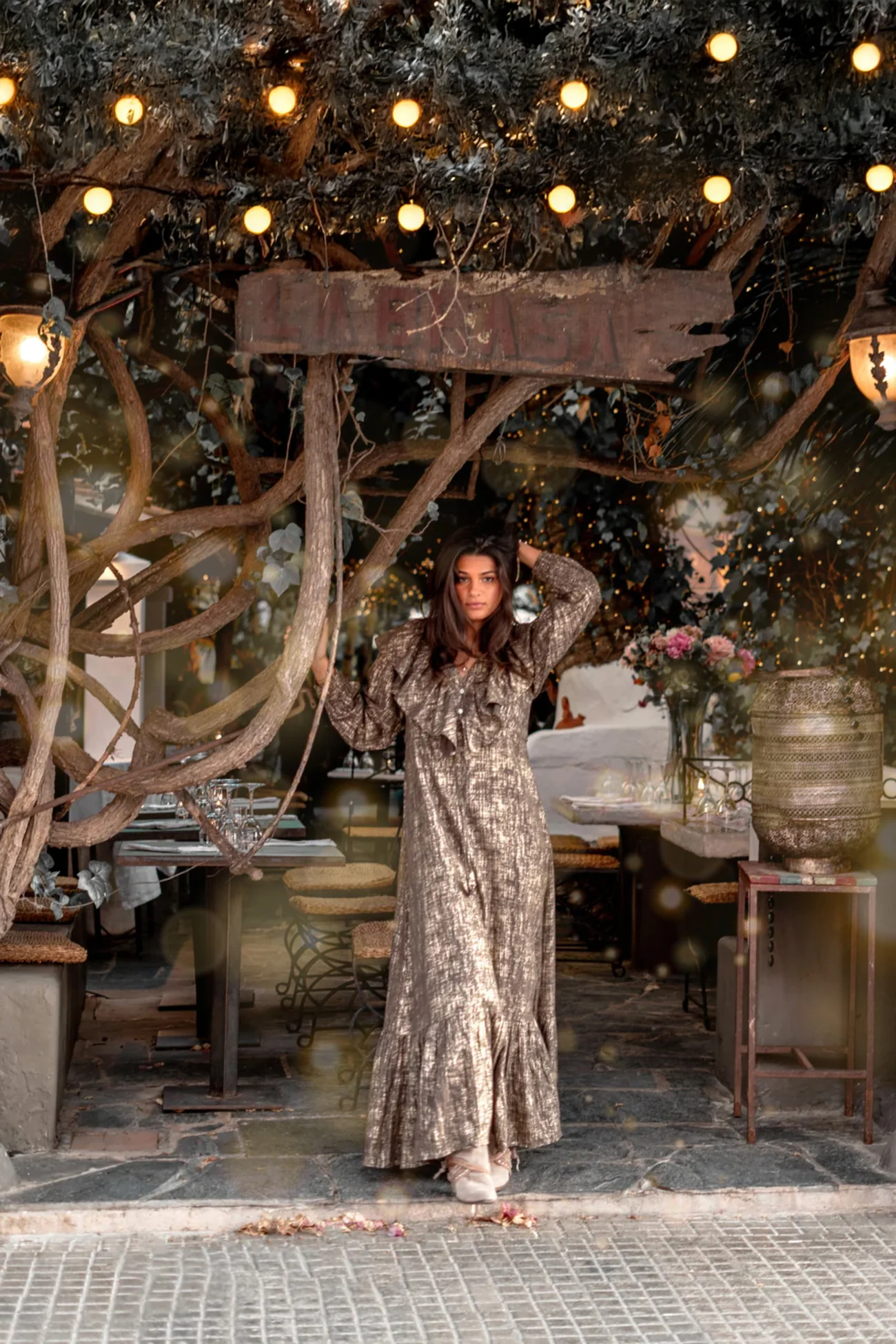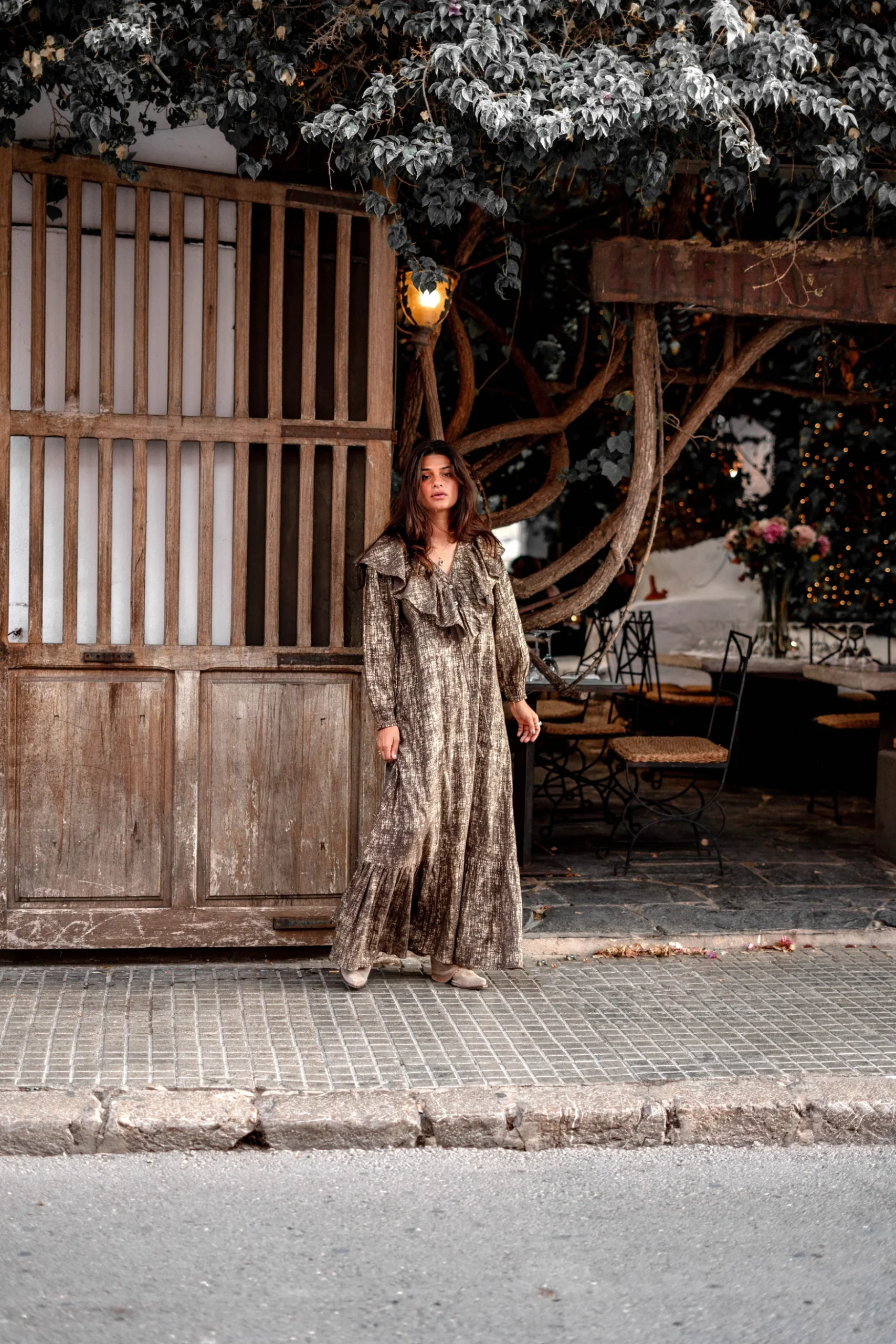 Deze Long Dress Ruffle Sparkle Taupe Gold van ibzmode in het taupe gold ademt Ibiza vibes. Heeft een V- hals, Knoopjes op de buste, Elastische mouwbanden, Ingezette onderjurk, Verstelbare tai Gemaakt van 100% katoen, licht en comfortabel voor warme dagen. Laat de zomer maar komen – jij bent er klaar voor.