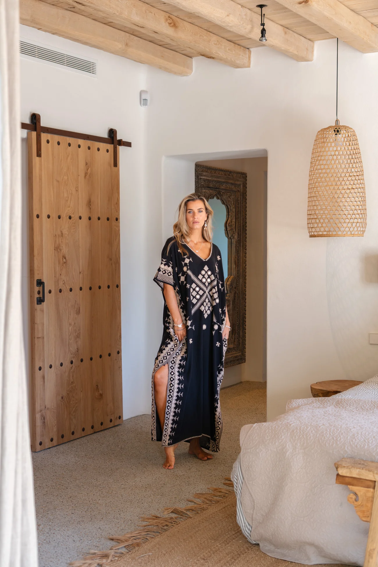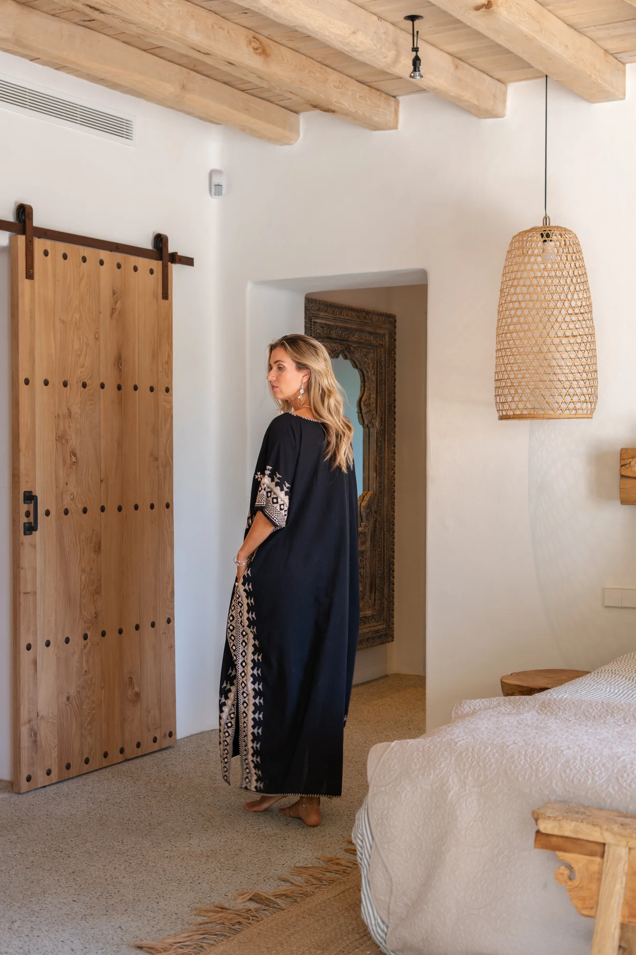Long Kaftan Silla Sundara Black hoort bij The Luxury Resort collectie van ibizamode. Deze luxe kaftan is gemaakt van zacht katoen dat luchtig aanvoelt. De ivory tint straalt rust en verfijning uit. Daardoor past Silla Sundara Black perfect bij high-end resort settings én ontspannen Ibiza momenten. Het silhouet is lang, vloeiend en elegant.