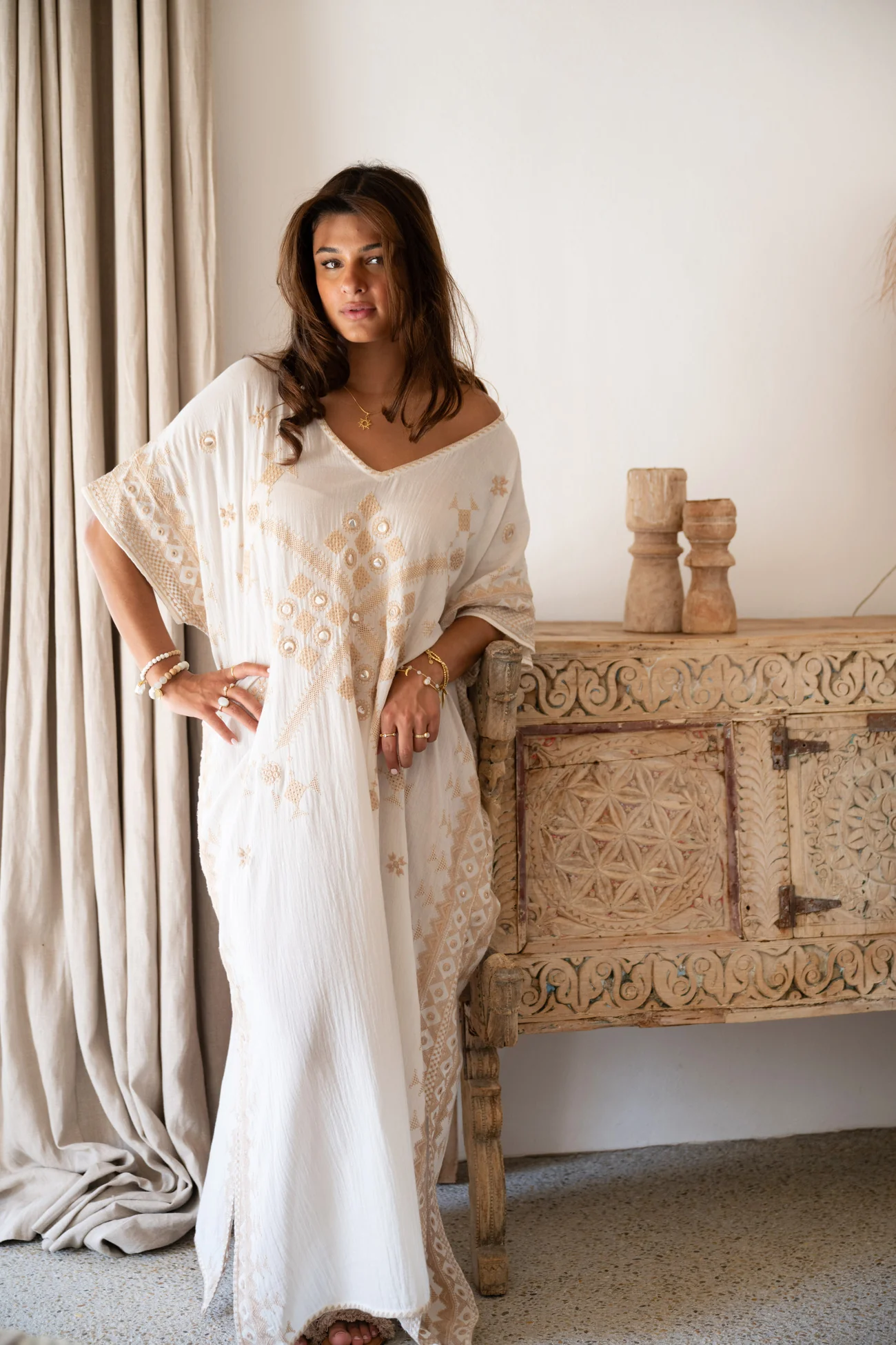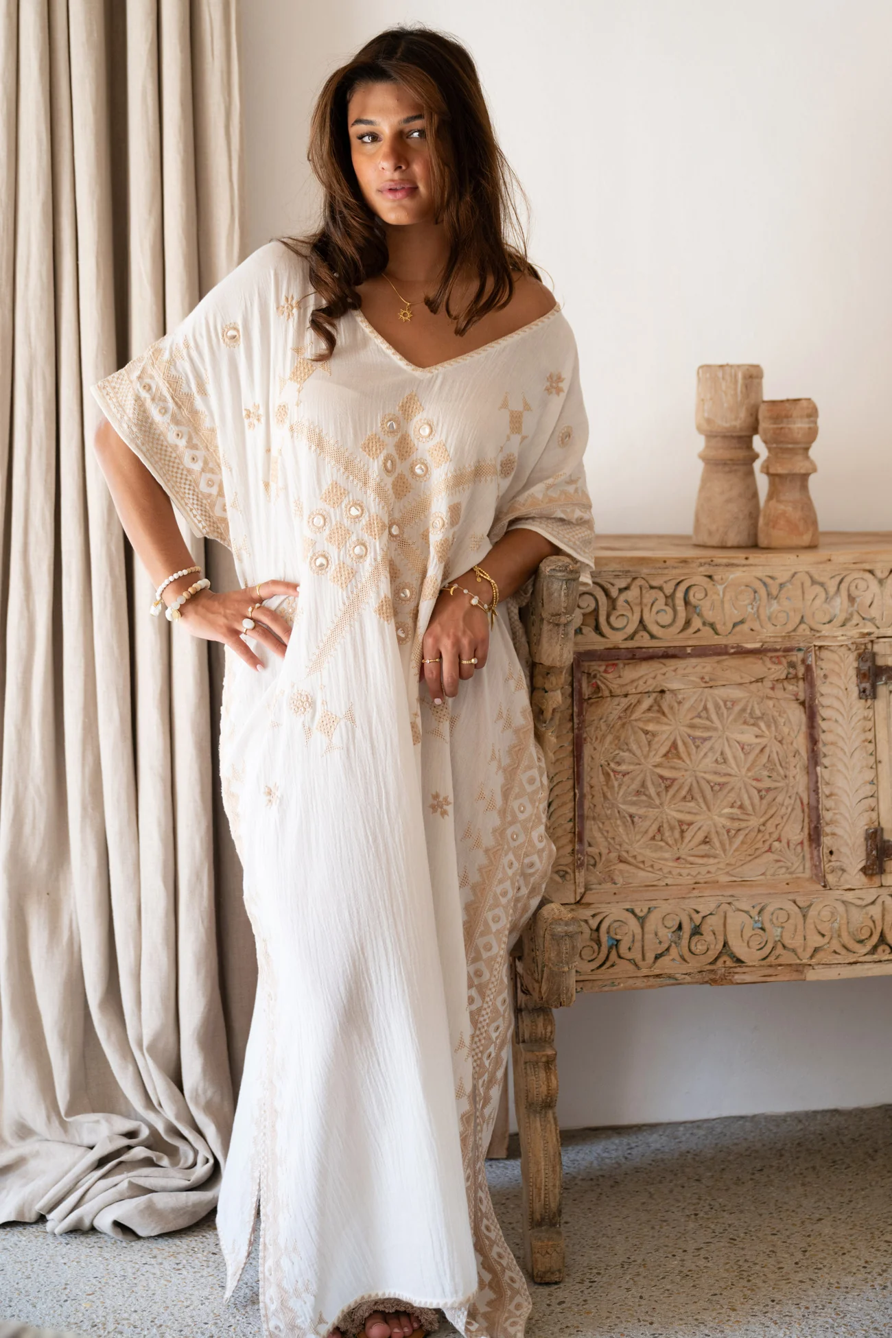 Vervolgens is deze lange kaftan ideaal voor beachclub looks. Overdag draag je Silla Sundara Ivory met platte sandalen en een luxe strandtas. Zo schuif je moeiteloos aan voor een lange lunch aan zee. De pasvorm blijft comfortabel, zelfs tijdens warme middagen. Daardoor voel je je ontspannen én stijlvol tegelijk.