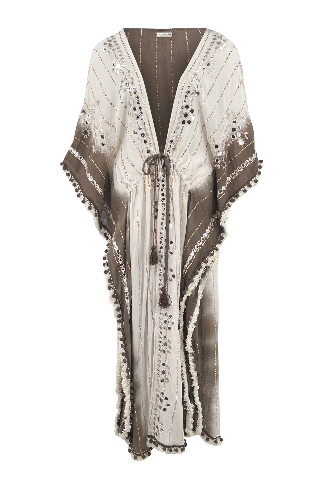 Met de Long Kimono Aine Lurex Beige/Brown van ibzmode ben je klaar voor elke summer getaway. Kimono is sierlijk bezet met sierspiegeltjes, embroidery, franjes en goudkleurige lurex garen, straa Draag het met je favoriete accessoires voor een echte brands of Ibiza-look. Bestel snel en geniet van de bohemian lifestyle, elke dag opnieuw.