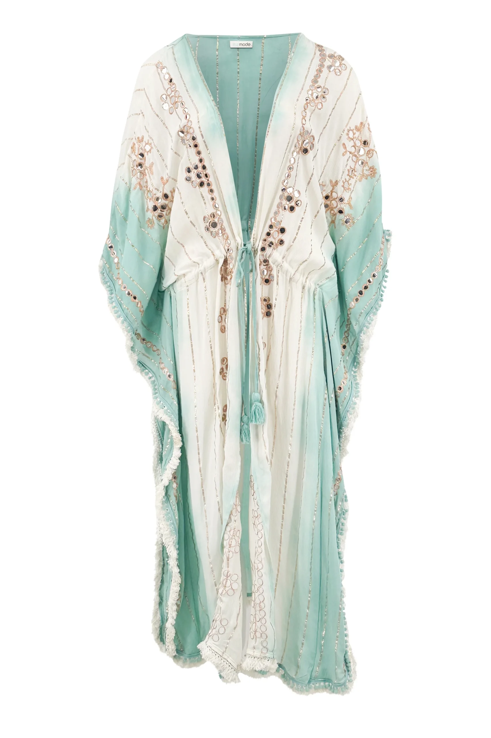 Op zoek naar een item met bohemian flair? Dan is de Long Kimono Aine Lurex White/Aqua van ibzmode jouw match. Kimono is sierlijk bezet met sierspiegeltjes, embroidery, franjes en goudkleurige lurex garen, straa De luchtige stof voelt zacht aan op je huid. Nu verkrijgbaar bij ibizamode – ontdek meer op Brands of Ibiza.