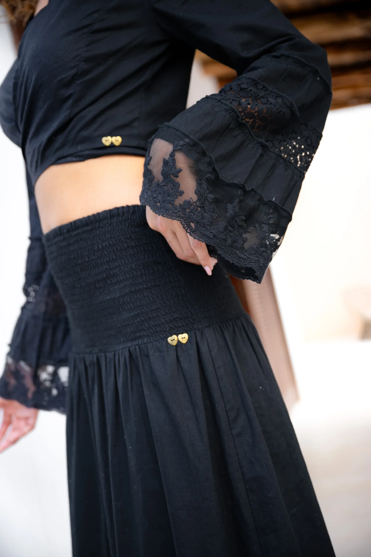 Deze lange zwarte rok heeft een comfortabele, gesmokte tailleband die mooi aansluit en zorgt voor een flatterend silhouet. Vanuit de taille valt de rok losjes naar beneden, waardoor er een luchtige beweging ontstaat bij iedere stap. Onderaan is de rok afgewerkt met meerdere lagen kant, wat diepte en textuur toevoegt aan het ontwerp.