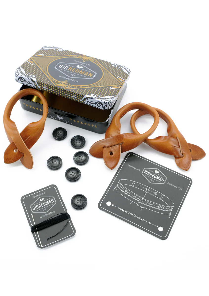 Ze worden geleverd in een stijlvol blikje inclusief 6 knopen, naald en draad en een afstandsbepaler om de knopen aan de binnenkant van je broek te bevestigen. Zo kan je ze gemakkelijk gebruiken met de stevige clip. Maar kan je er ook voor kiezen om ze te dragen op de klassieke manier.