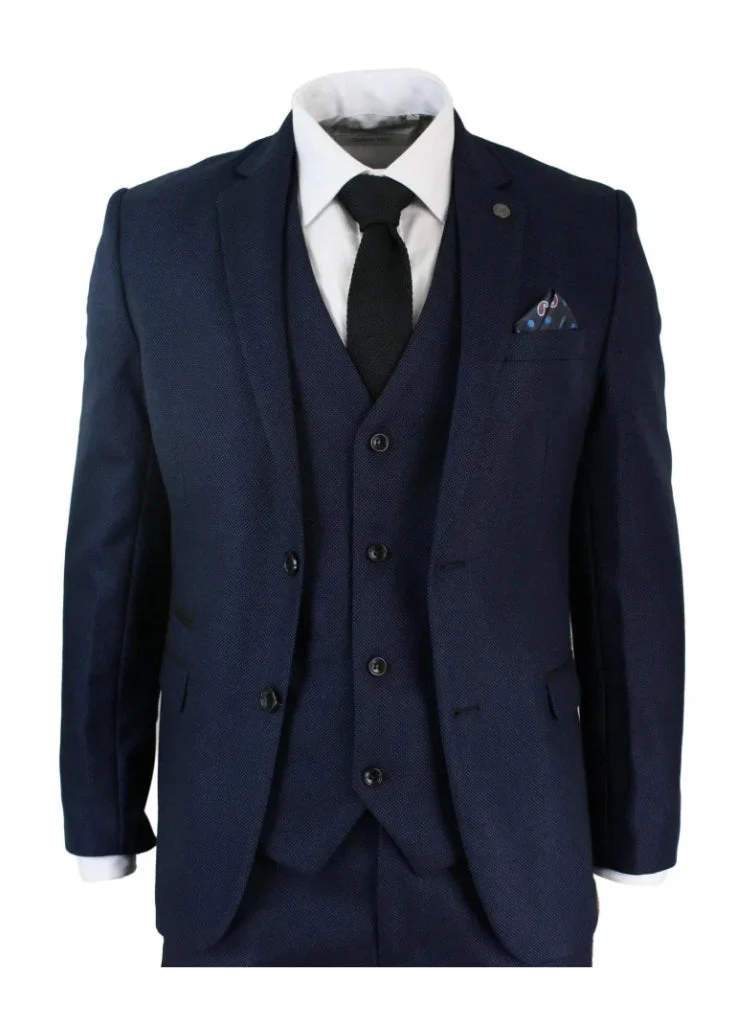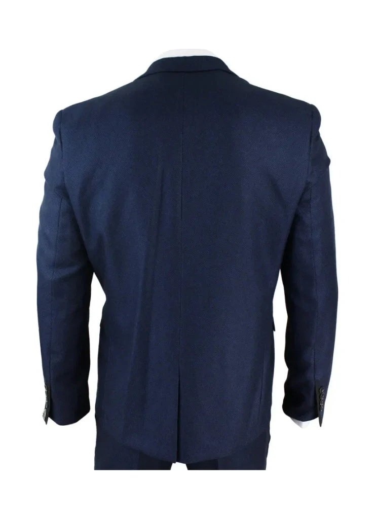 Voor degenen die op zoek zijn naar een complete look, is er het Navy blauw heren pak Callum. Dit pak bestaat uit het colbert, gilet en pantalon, allemaal in dezelfde stijlvolle navy blauwe kleur. Dit driedelige pak biedt een samenhangende en elegante uitstraling die perfect is voor formele evenementen, bruiloften of zakelijke bijeenkomsten. Door de consistentie in kleur en stijl straal je zelfverzekerdheid en klasse uit.