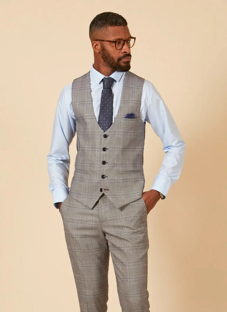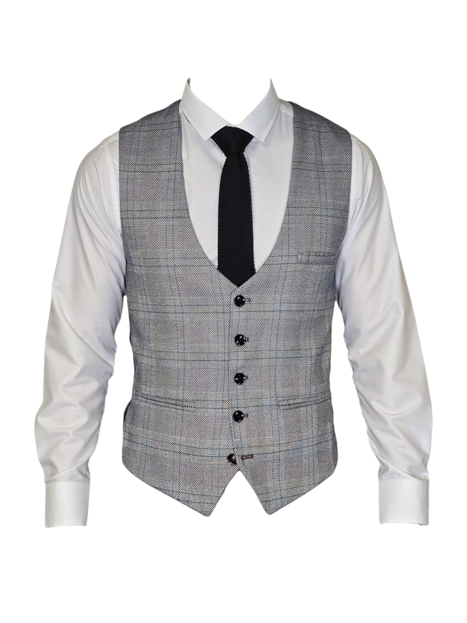 Dit gilet is onderdeel van het complete 3-delige kostuum Check Jerry Grey. Hiermee heb je de mogelijkheid om je outfit compleet te maken met een bijpassend colberts en pantalon. Samen vormen ze een perfect op elkaar afgestemde look die je zelfverzekerd en stijlvol maakt. Of je nu een bruiloft bijwoont, een belangrijke zakelijke afspraak hebt, of gewoon indruk wilt maken tijdens een avondje uit, dit kostuum biedt de perfecte oplossing.