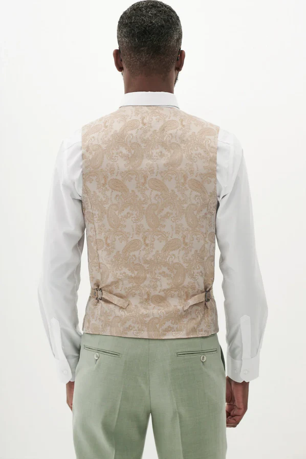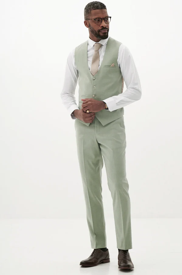 Het Marc Darcy – Gilet Finley Moss Green valt op door de frisse, lichtgroene kleur die anders is dan de standaard marineblauw of zwart. Dit maakt het niet alleen uniek, maar ook perfect voor zomerbruiloften en andere feestelijke gelegenheden. Het gilet heeft een verfijnde uitstraling die goed te combineren is met verschillende stijlen, van formeel tot meer casual.