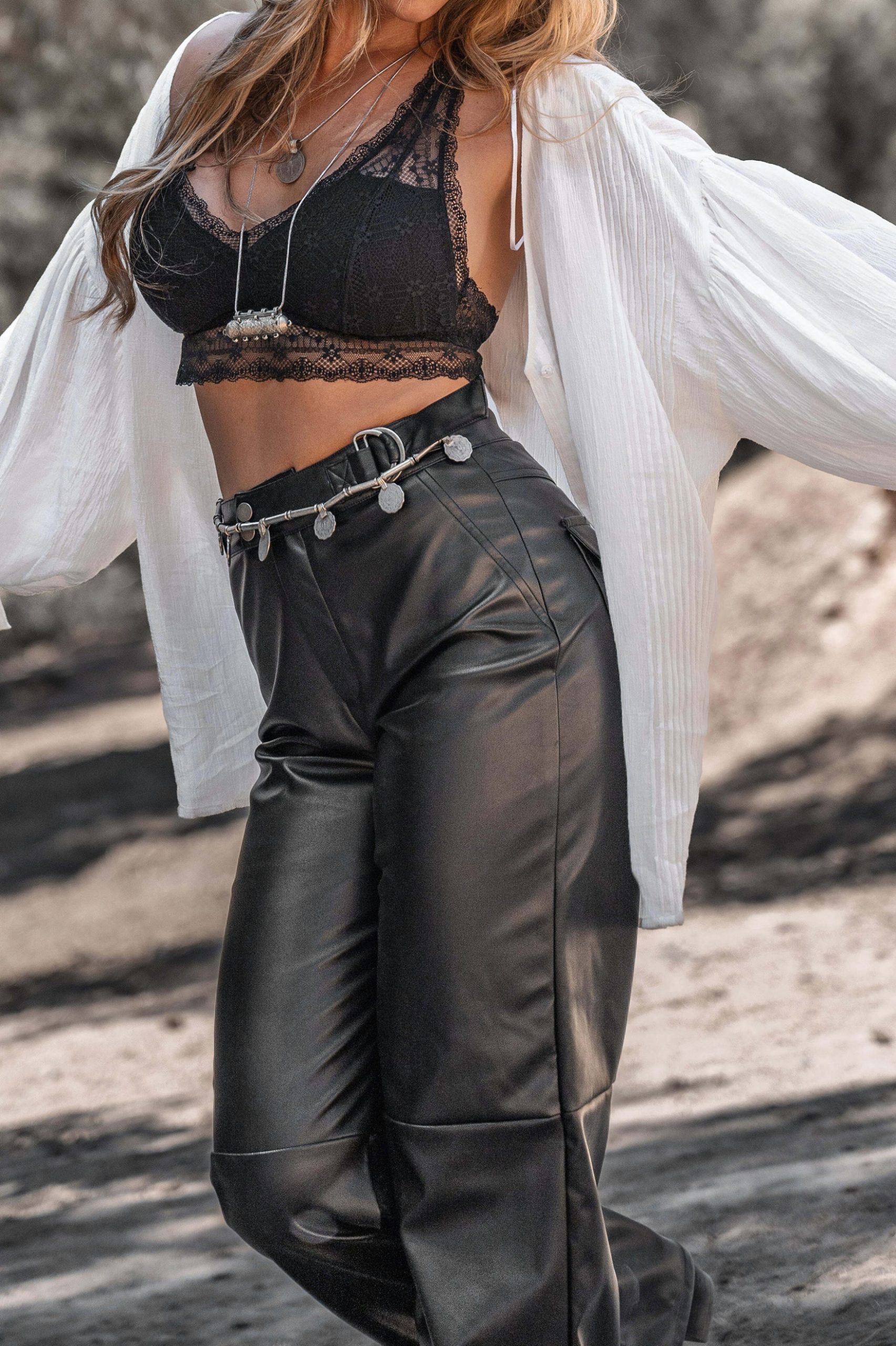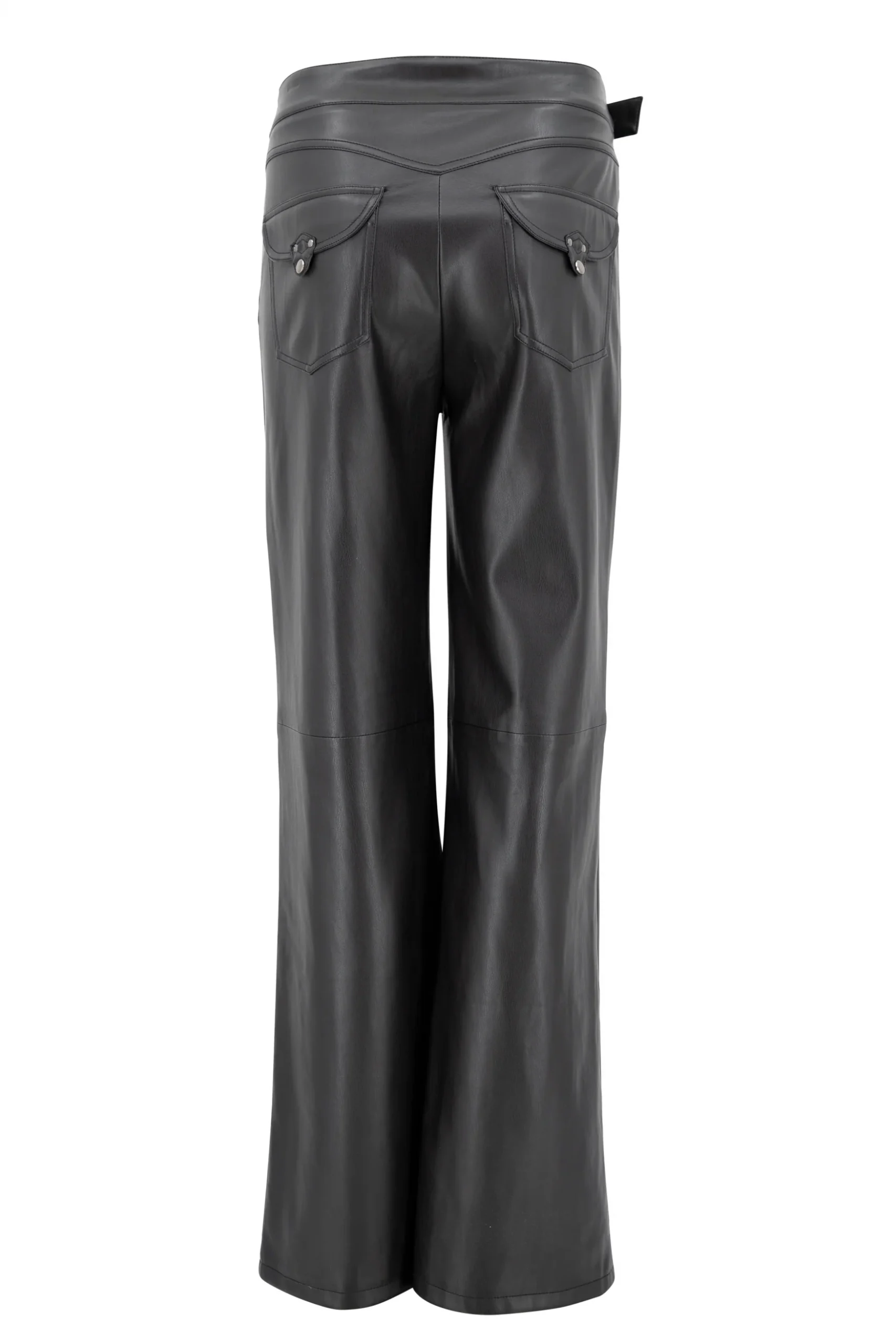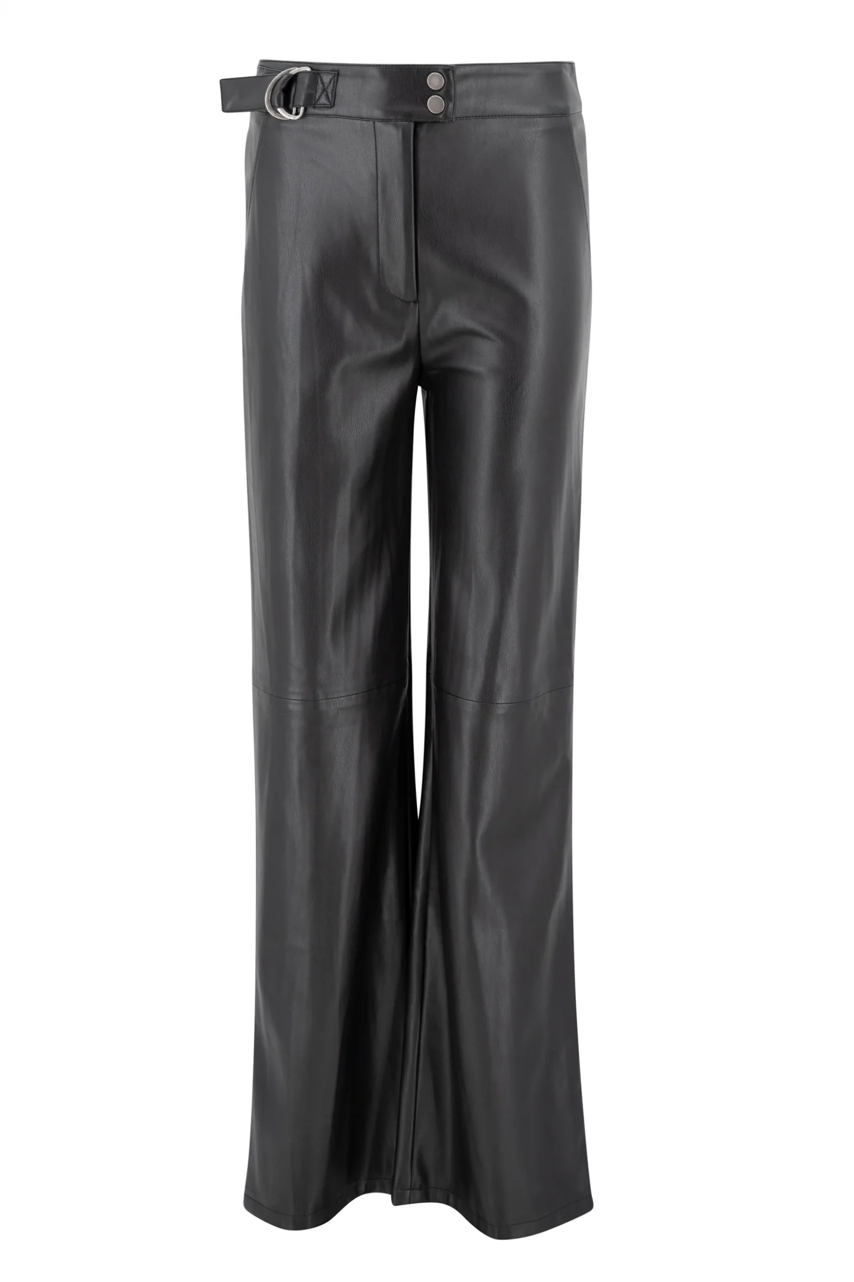 Creëer jouw ultieme zomerse look met de Maud Western PU Pants in de kleur black. PU leder broek, te verstellen in de taille, wide leg fit Voeg deze must-have toe aan je zomergarderobe.