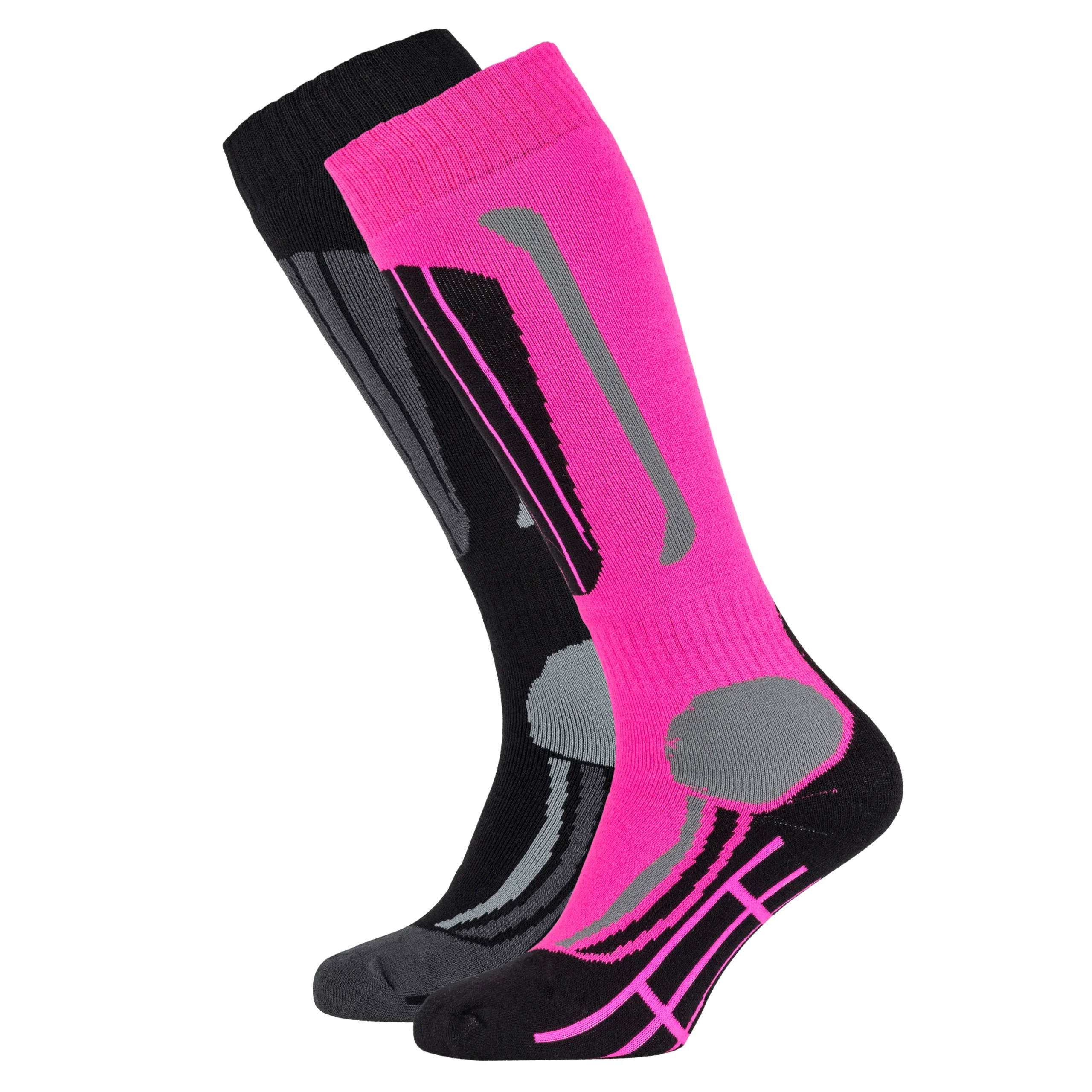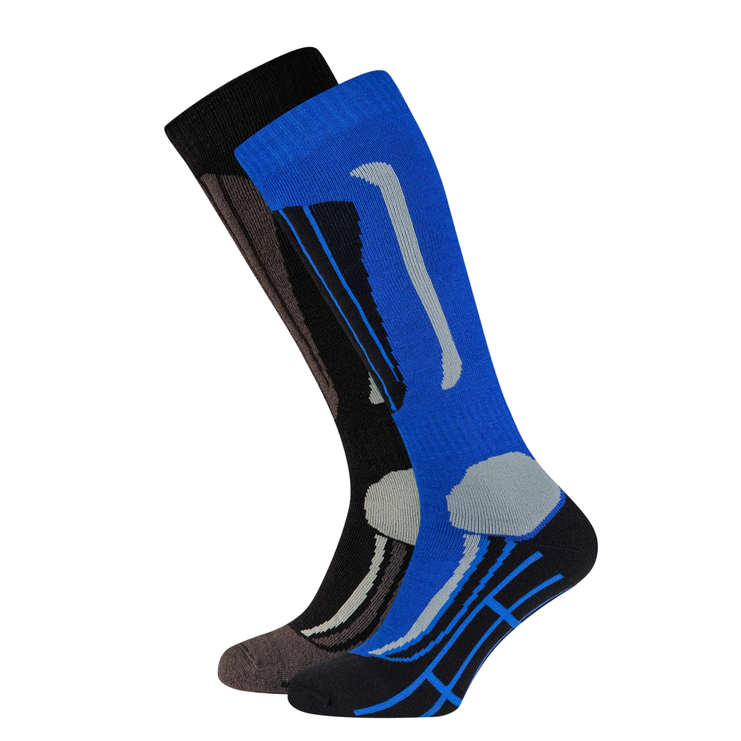 Warme skisokken voor jongens of meisjes. Gemaakt van een combinatie van wol, acryl, polyamide en elastaan. Deze skisokken worden verkocht in een 2-pack en zijn verkrijgbaar in diverse trendy kleuren en dessins.