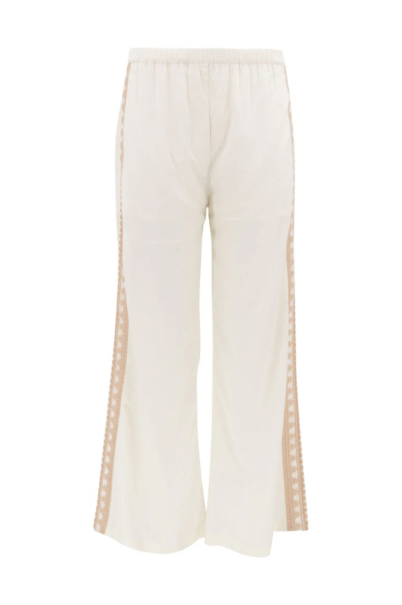 Op zoek naar een item met bohemian flair? Dan is de Pantalon Agar Ivory van ibzmode jouw match. Elastische band aan de bovenzijde, bewerkt met kanten rand van lurex garen aan de zijkanten, heeft 2 Perfect te combineren met slippers, een basic top of een lichte blouse. Nu verkrijgbaar bij ibizamode – ontdek meer op Brands of Ibiza.