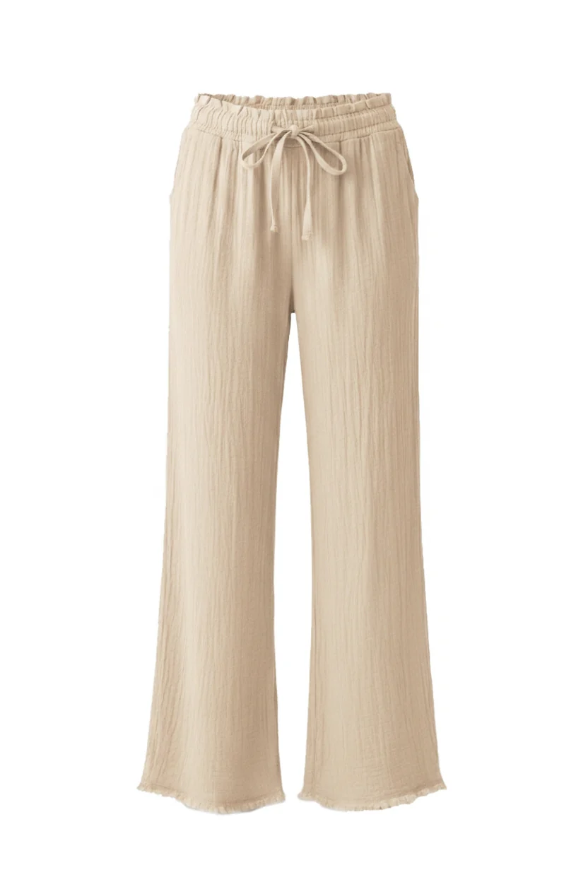 De Pantalon Zora Auralea Beige staat voor resort wear dames die zacht aanvoelt, comfortabel zit en elke zomerse dag klopt.