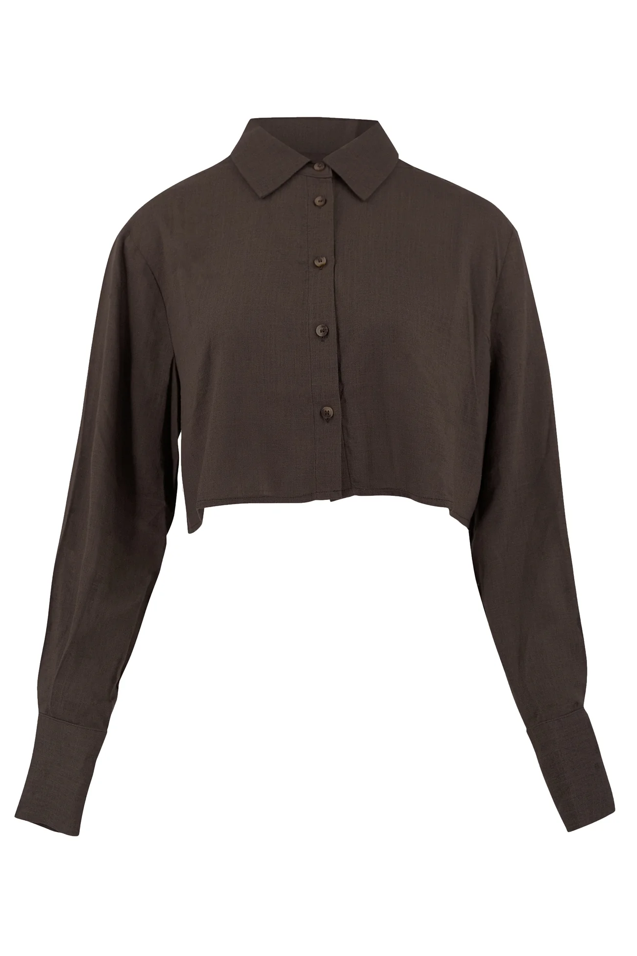 Geef jouw garderobe een update met de Seth cropped blouse Dark Taupe, ontworpen voor zonnige dagen. Soepelvallende korte blouse van een viscose- en linnenmix, knoopsluiting aan de voorkant, leuk in co Voeg deze must-have toe aan je zomergarderobe.
